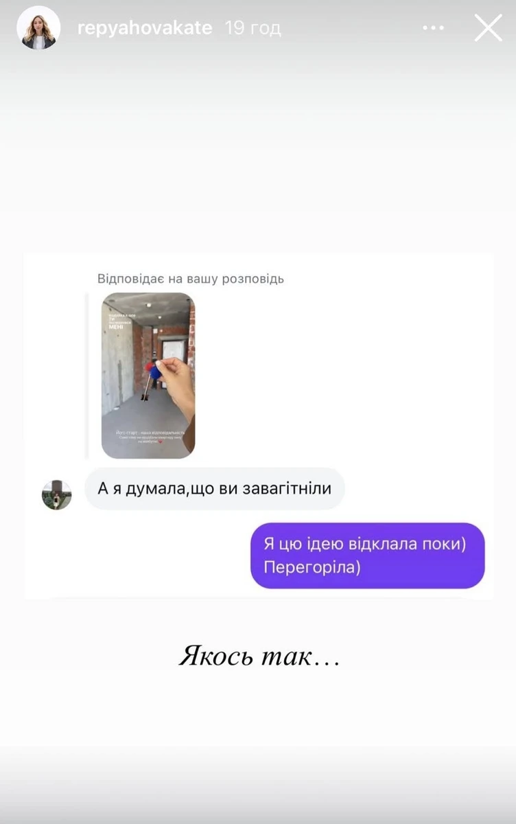 "Я цю ідею відклала поки. Перегоріла", - зізналася Репяхова.