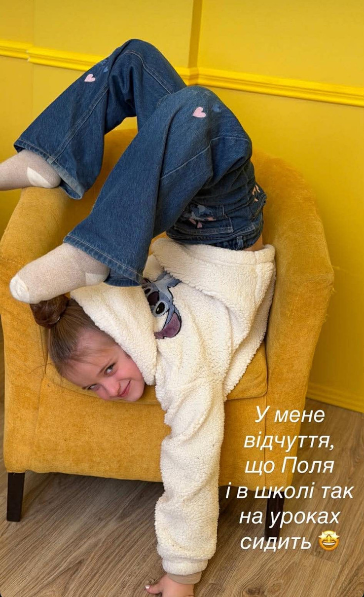 У своєму Instagram телеведуча виклала кілька фото, на яких 7-річна Поліна у карколомних позах, зокрема догори дригом і в шпагаті.