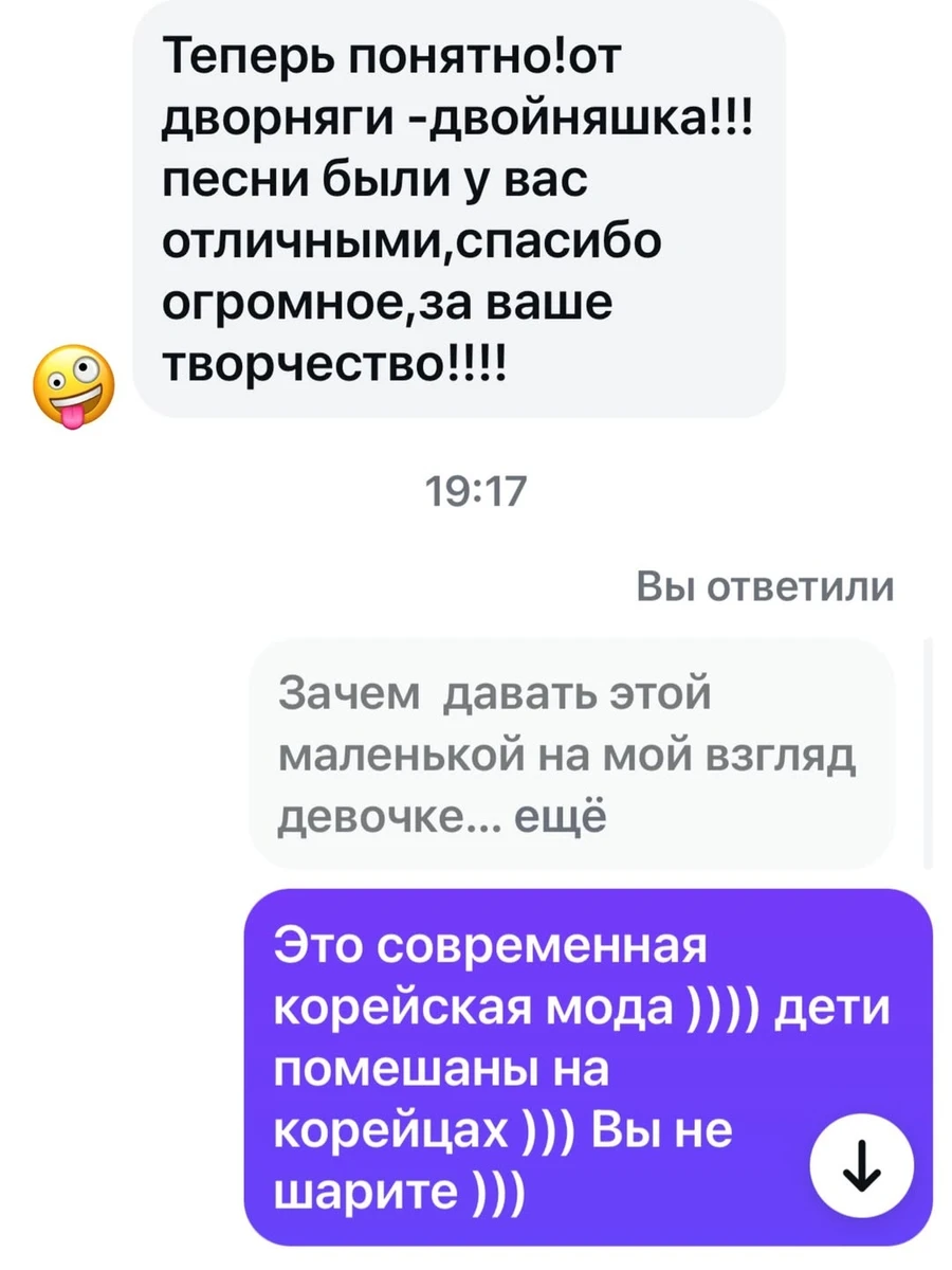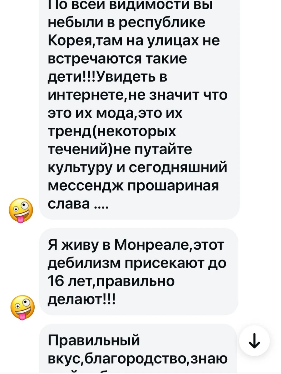 "Виклала сторіс із фото Лаури. І тут прийшла мадам в дірект із лекцією про виховання, правильний смак, благородство, Корейську Республіку і про те, як мені виховувати мою дитину. І от у мене питання. Чи то в мене надто розгойдана нервова система, чи то я реально дуже невихована людина, тому що в моменті мені просто закортіло послати людину нах@й. Але я її просто заблокувала і вирішила поділитися цим тут", - написала Слава.