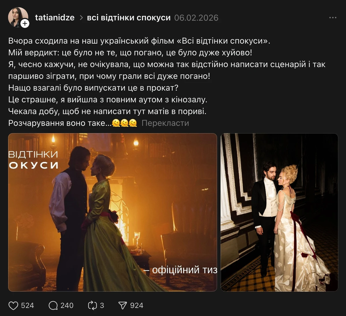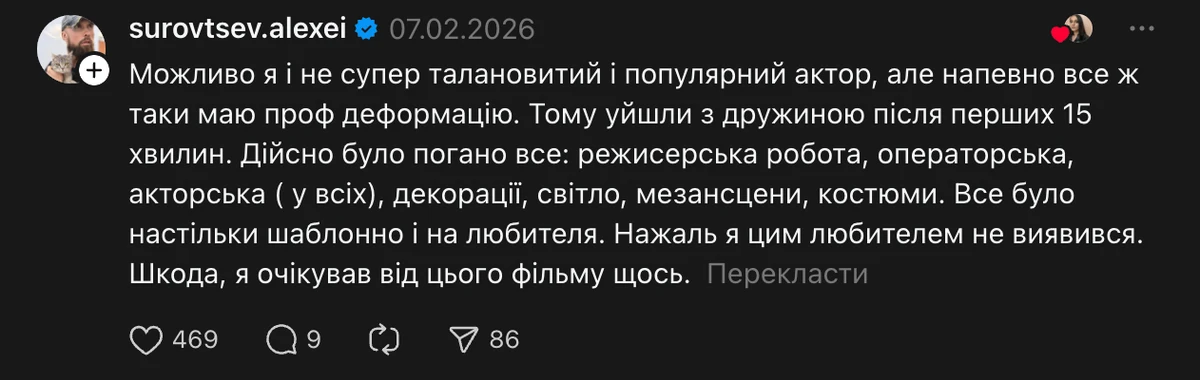 Багато користувачів Threads вже залишили свої відгуки - щоправда, негативні. Хтось критикує акторську гру, хтось зйомку, ну а деякі називають фільм просто - "крінж".