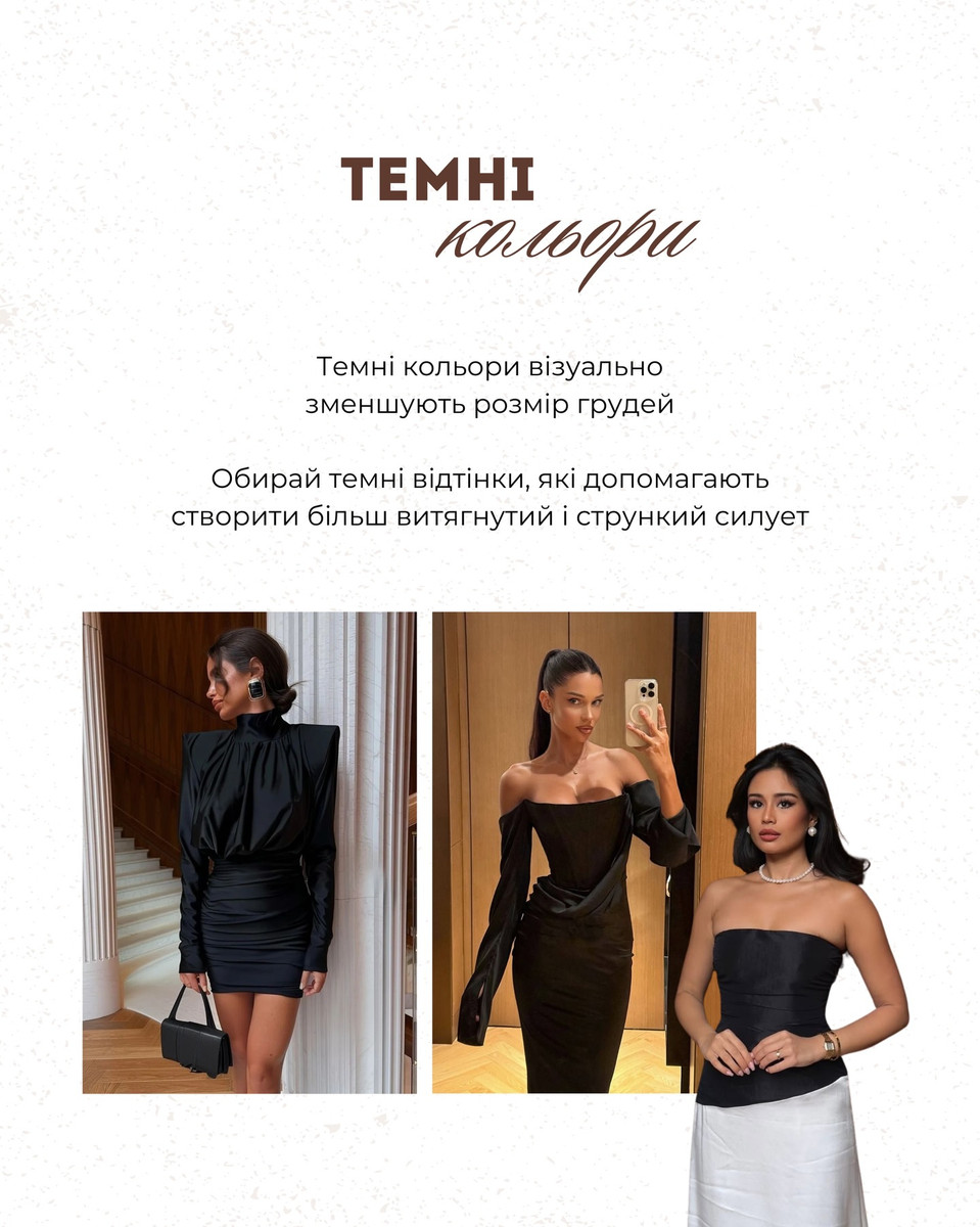 По-перше, пишногрудим красуням слід звернути увагу на мінімалізм і уникати надмірного об'єму в грудях. Тобто ніяких рюшів та пишних рукавів.