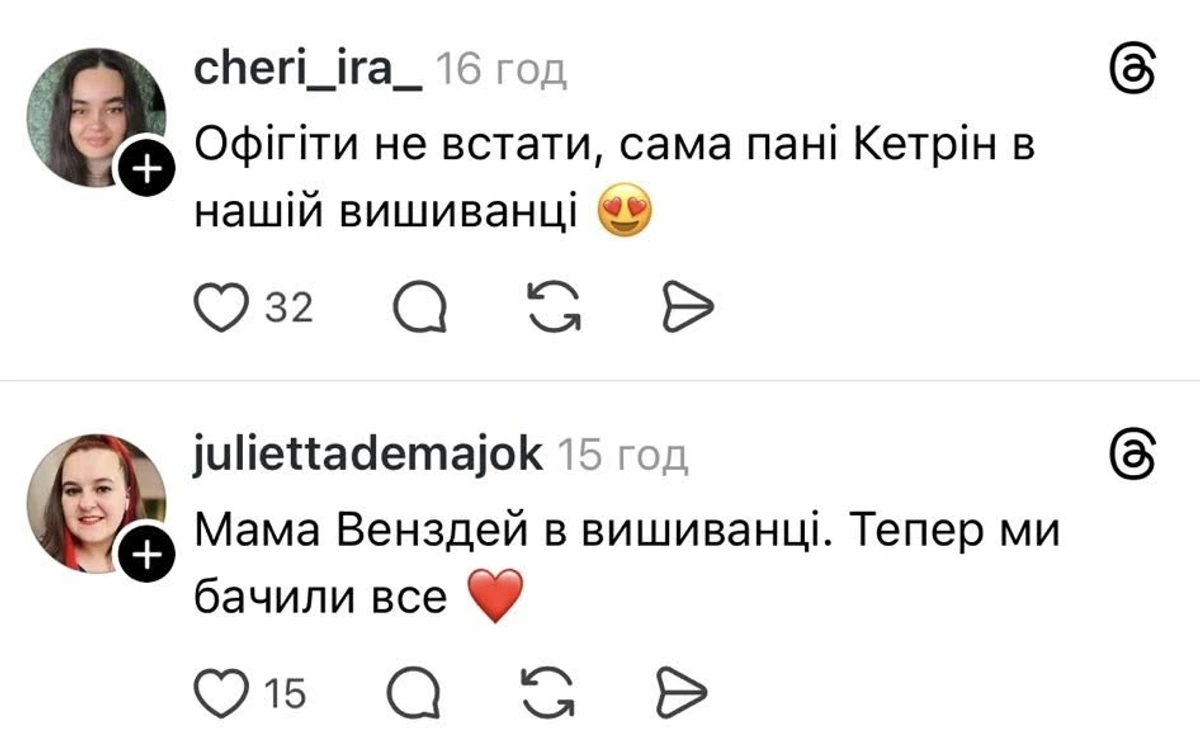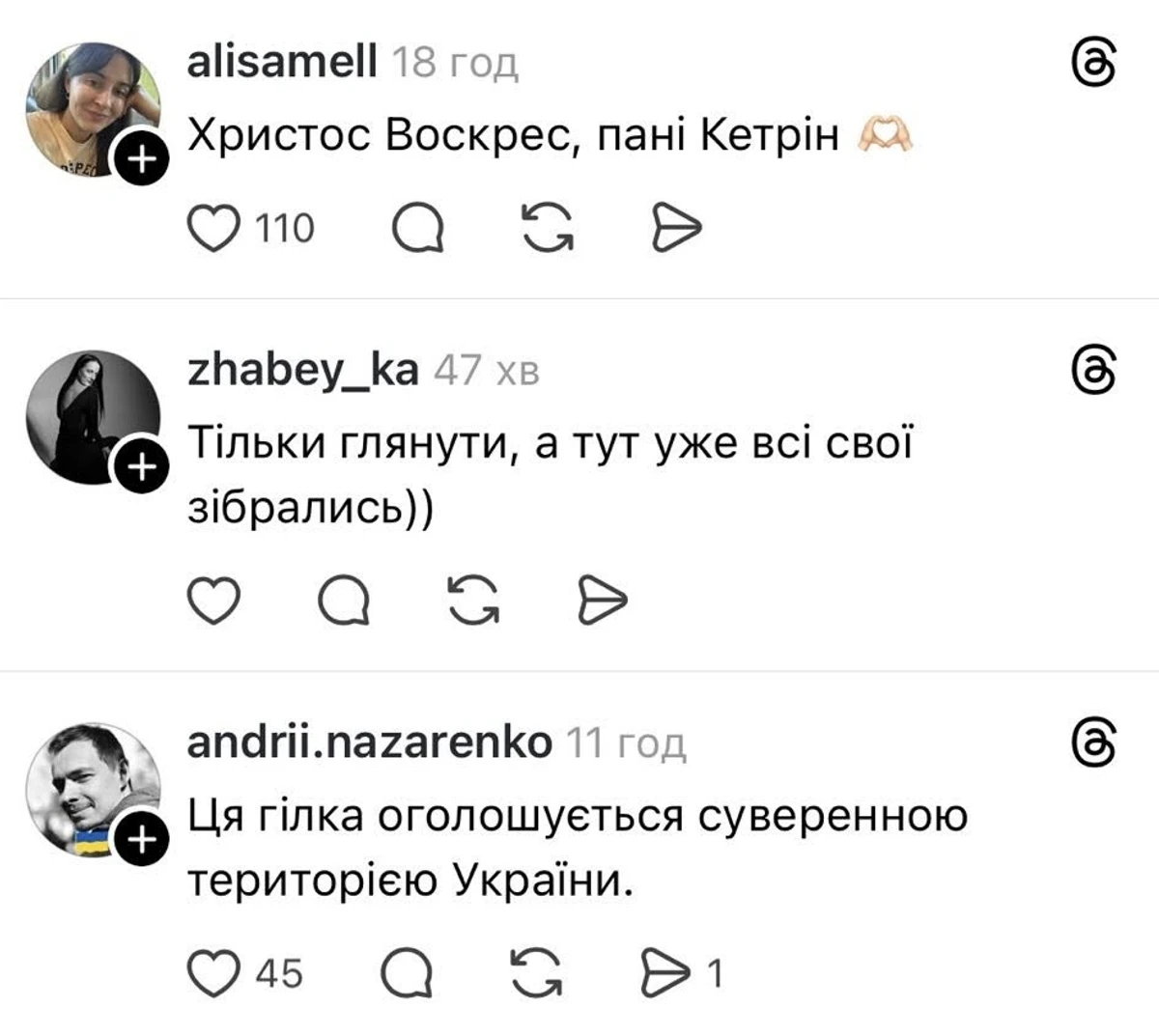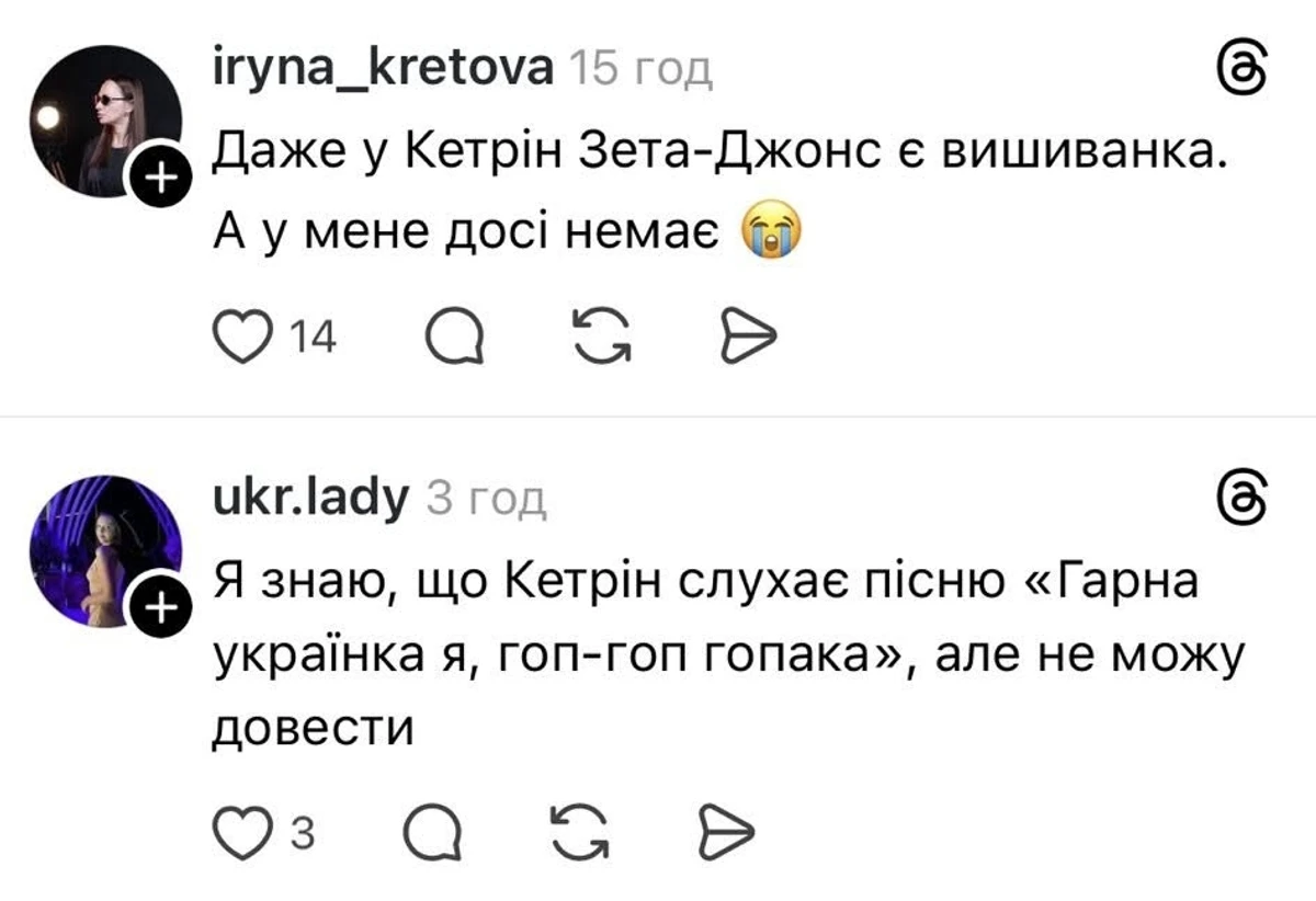 "Кетрін Зета-Джонс у вишиванці, а ти ще ні!.. Ну наша... Христос воскрес, пані Кетрін... Катруся - молодець! Будь як Катруся", - пишуть актрисі.