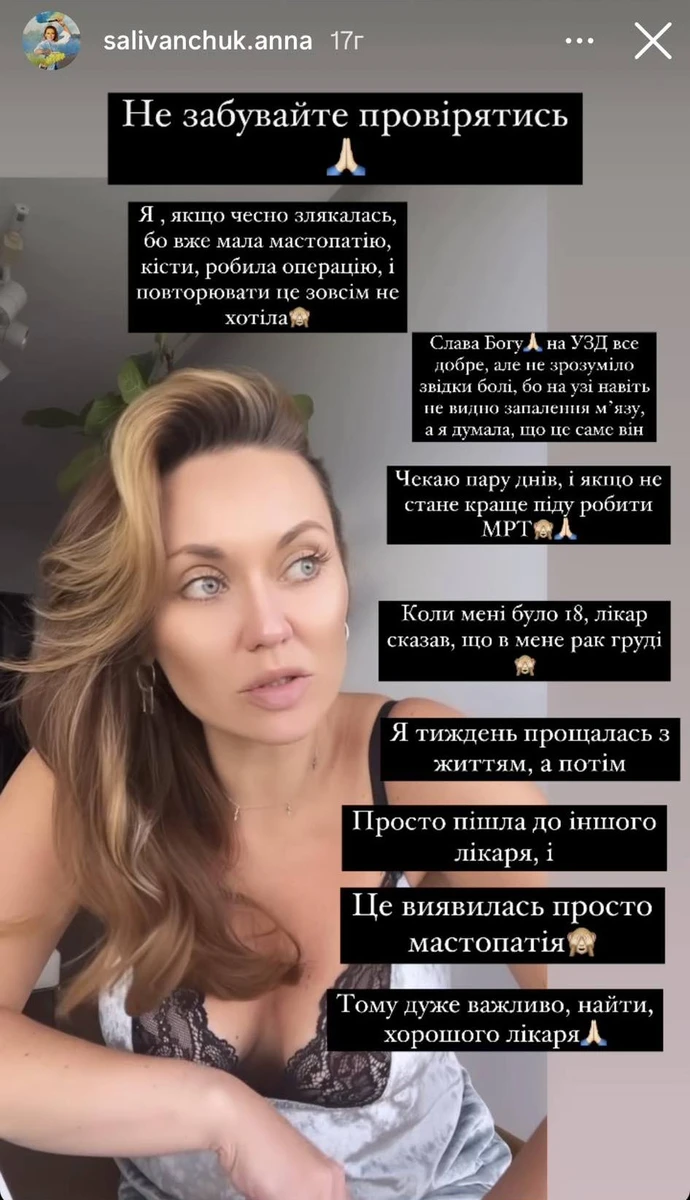 Акторка Анна Саліванчук вирішила звернутися до своїх підписниць із важливим закликом: не нехтувати регулярними обстеженнями грудей.