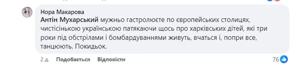 Думки коментаторів розділилися. Когось кадри зворушили, а когось - засмутили та обурили, адже діти і хореографка, яка ними керує, балакають мовою країни-агресорки. Висловився з цього приводу, зокрема, шоумен та письменник Антін Мухарський, очікувано спричинивши палку дискусію у своєму Facebook.