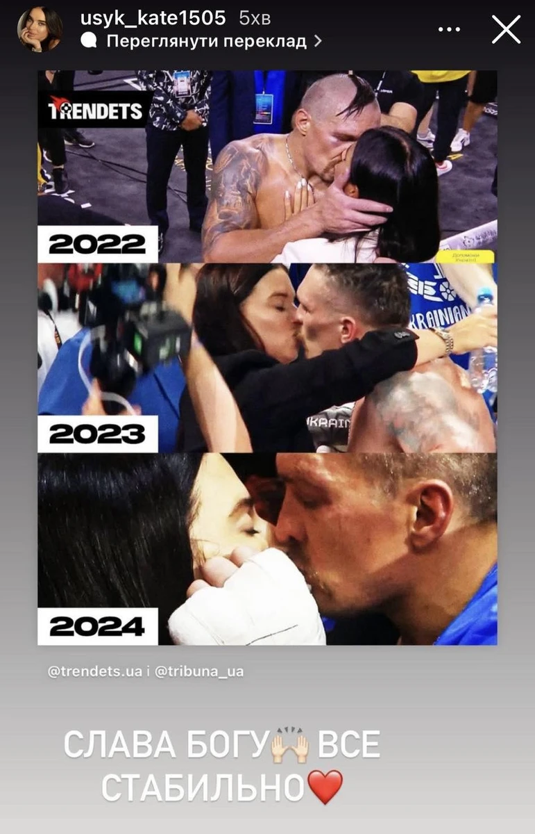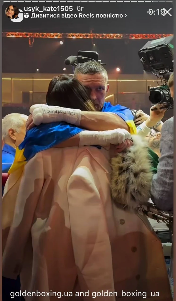 Дружина боксера Олександра Усика, який здобув звання абсолютного чемпіона світу у суперважкій вазі у поєдинку з Тайсоном Ф'юрі, привітала його з перемогою поцілунком та подякувала всім, хто підтримував її чоловіка.
