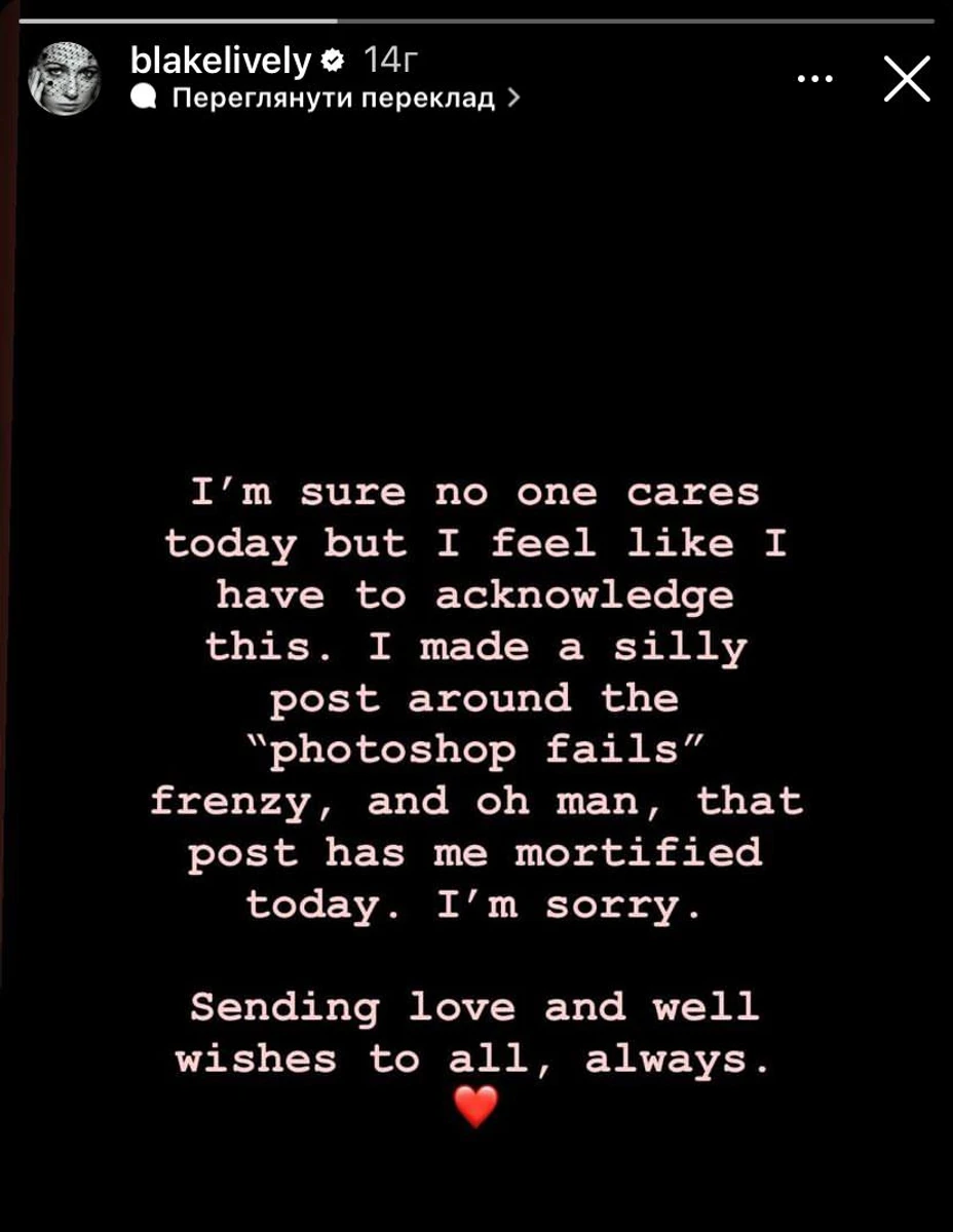 "Я впевнена, що сьогодні всім байдуже, але я відчуваю, що маю це визнати. Я зробила дурний допис про "невдалий фотошоп", згораю з сорому сьогодні. Я перепрошую. Я шлю любов і бажаю всього найкращого, завжди", - написала Блейк.