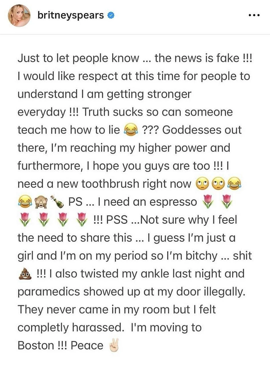"Просто щоби люди знали... новина фейкова! Мені зараз хотілося би поваги, щоби люди розуміли, що з кожним днем я стаю сильніша! Правда - відстій, тож чи може мене хтось навчити брехати? Агов, богині, я досягаю своєї найбільшої сили, а також, сподіваюся, і ви, хлопці! Просто зараз мені потрібна нова зубна щітка. PS... Мені потрібен еспресо!!! PSS... Не впевнена щодо того, чому відчуваю потребу ділитися цим... Гадаю, я просто дівчина, в мене зараз менструація, тому я стервозна... от лайно!", - написала Брітні.