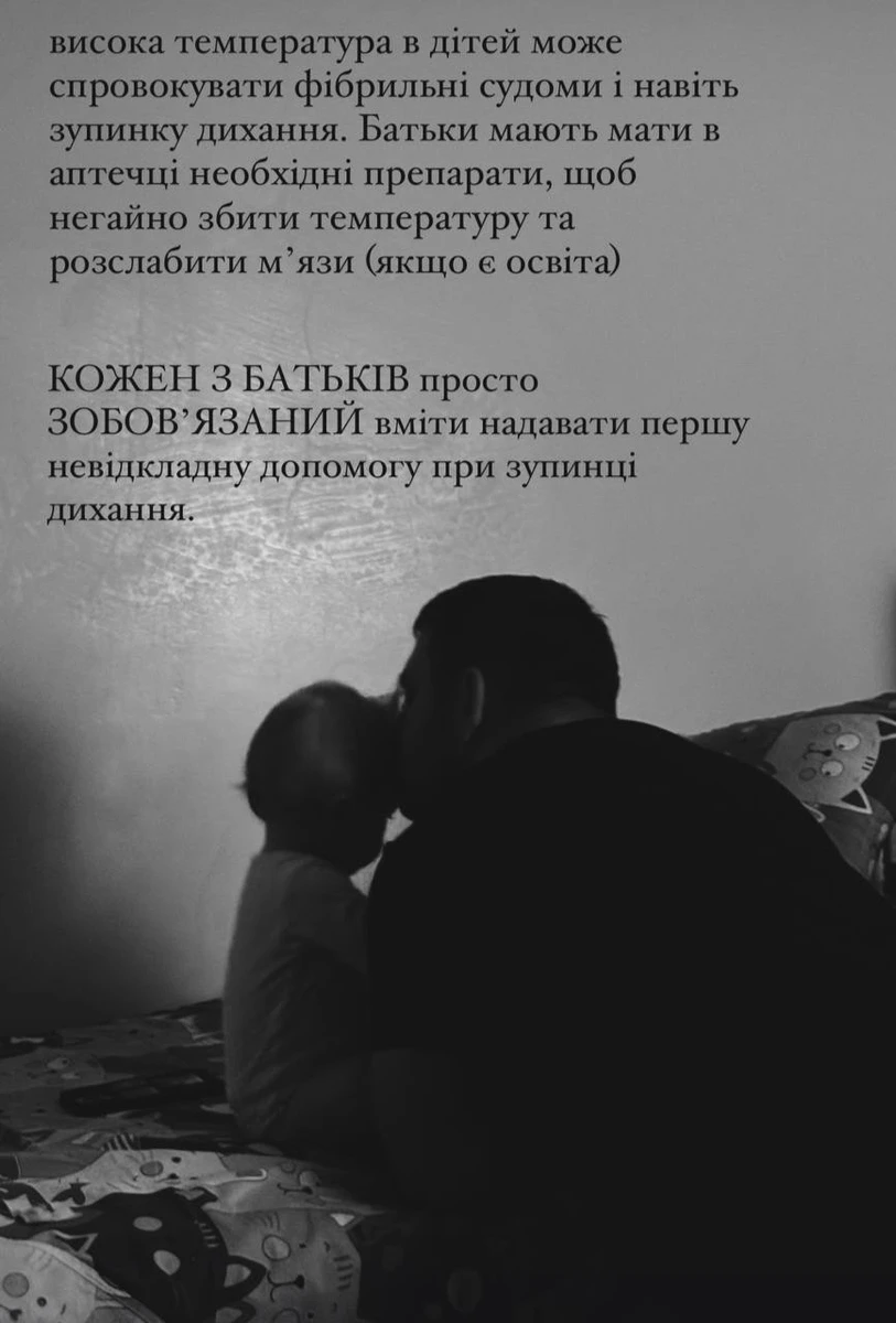 "Висока температура в дітей може спровокувати фібрильні судоми і навіть зупинку дихання. Батьки повинні мати в аптечці необхідні препарати, щоб негайно збити температуру та розслабити мʼязи (якщо є освіта). Кожен з батьків просто зобовʼязаний вміти надавати першу невідкладну допомогу при зупинці дихання", - звернулася до аудиторії блогерка.