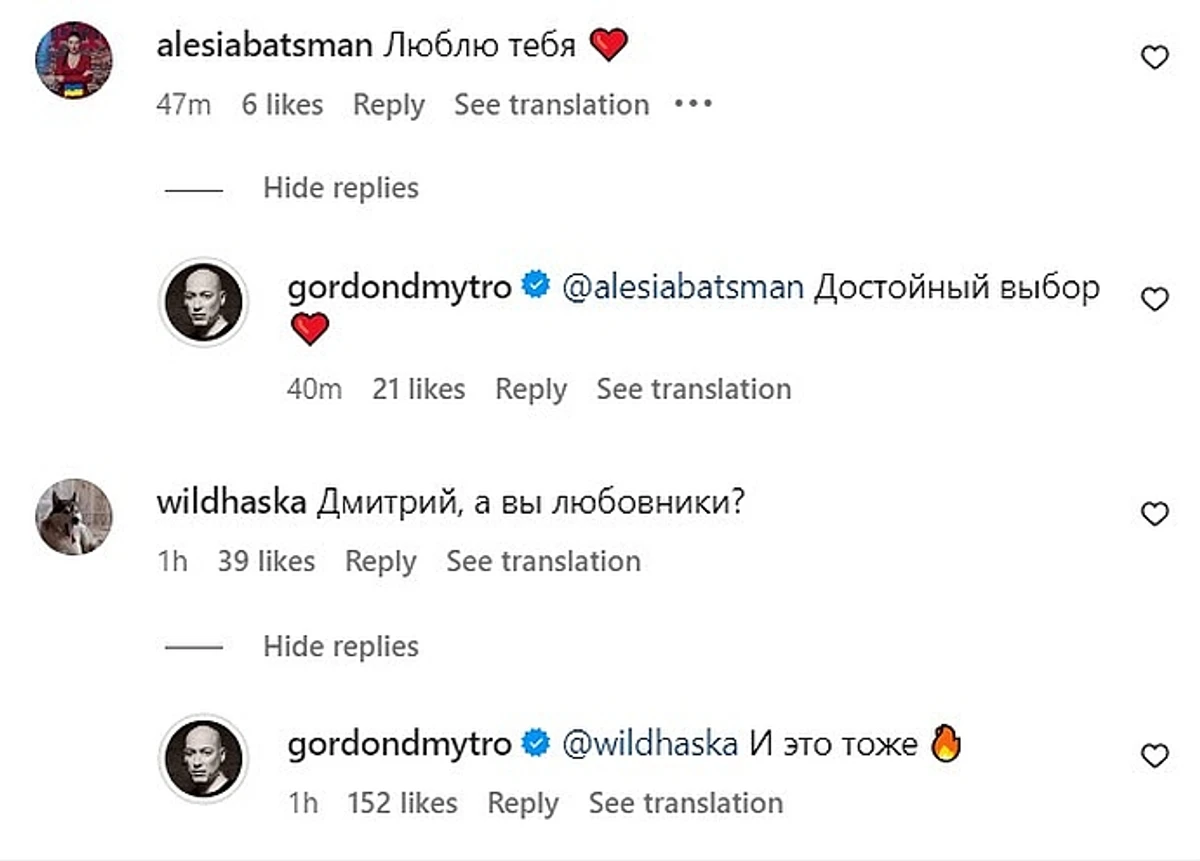У коментарях Гордон уже дозволив собі погуморити, зокрема відповідаючи на слова кохання від Бацман.
