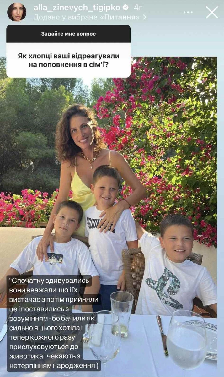 Дружина 64-річного банкіра Сергія Тігіпка, бізнесвумен Алла Зіневич-Тігіпко, яка днями поділилася радісною новиною про майбутнє поповнення в сім'ї, розказала, як поставилися до неї троє її старших синів.