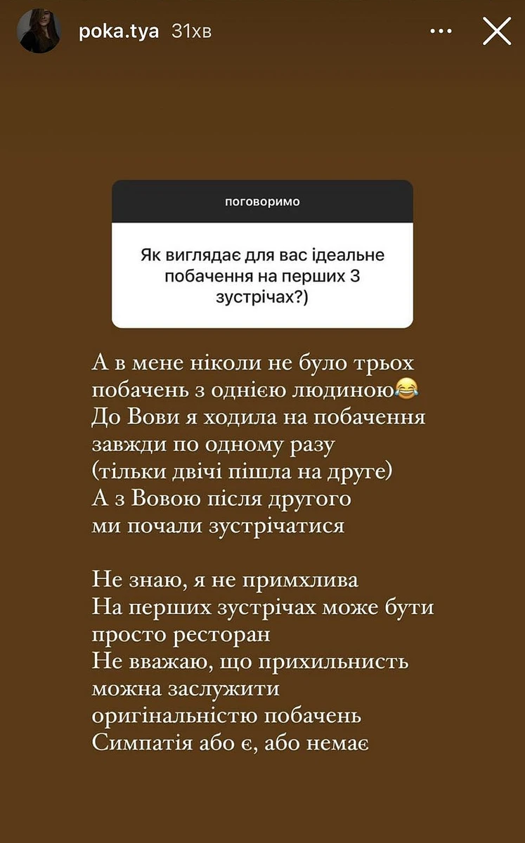 "І це у вашому світі тільки чоловік може завершити стосунки. Якщо мене буде щось глобально не влаштовувати, то я сама піду. Я не в положенні "останнього шансу", дівчата", - наголосила Полтавська.