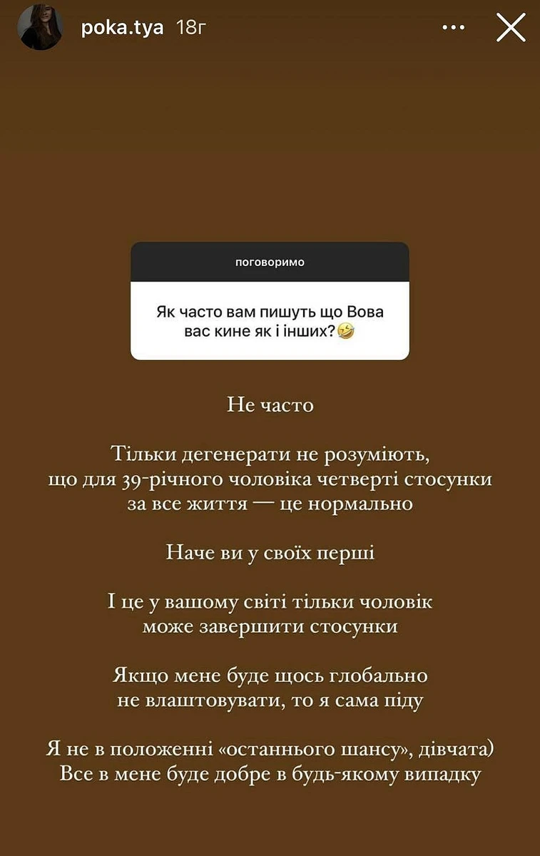 "Тільки дегенерати не розуміють, що для 39-річного чоловіка четверті стосунки за все життя - це нормально. Наче ви у своїх перші", - зізначила блогерка.