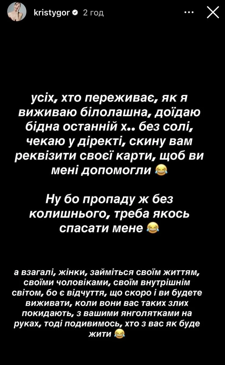 "Усіх, хто переживає, як я виживаю, бідолашна, доїдаю, бідна, останній х... без солі, чекаю у діректі, скину вам реквізити своєї карти, щоб ви мені допомогли. Ну бо пропаду ж без колишнього, треба якось спасати мене", - поіронізувала Горняк у сторіс.