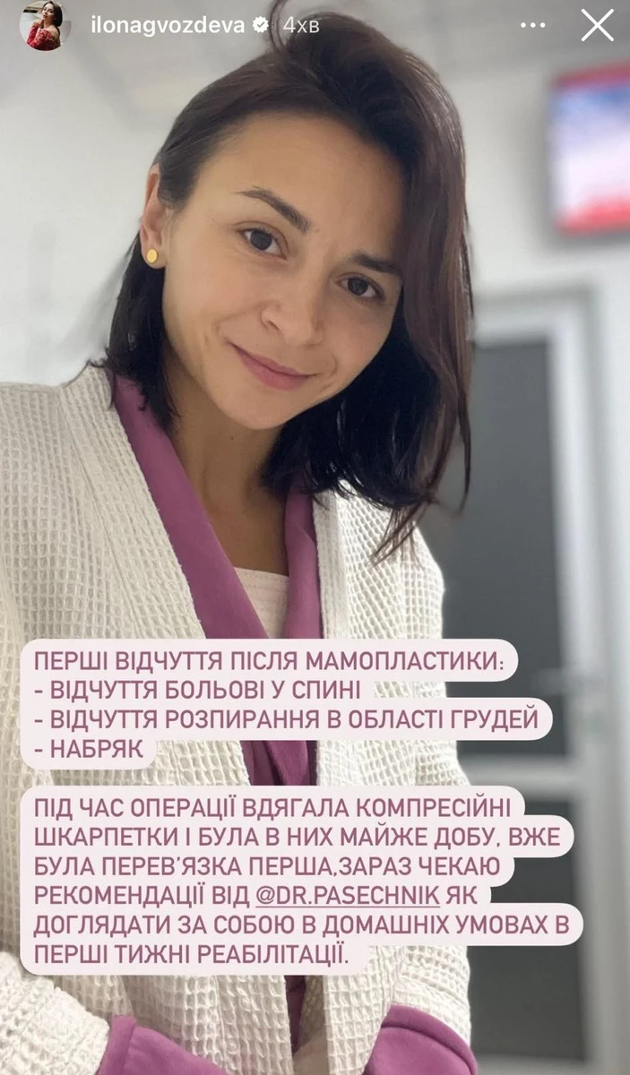 Хореографка Ілона Гвоздьова зробила операцію зі збільшення грудей. Про це вона повідомила в мережі та показалася у перший і другий день після процедури.