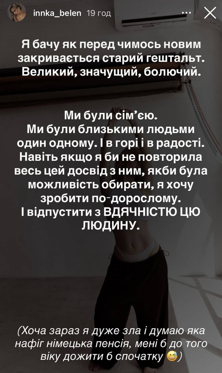 "Я бачу, як перед чимось новим закривається старий гештальт. Великий, значущий, болючий. Ми були сім'єю. Ми були близькими людьми один одному. І в горі, і в радості. Навіть якщо я би не повторила цей досвід з ним, якби була можливість обирати, я хочу зробити по-дорослому. І відпустити з вдячністю цю людину. (Хоча зараз я дуже зла і думаю, яка нафіг німецька пенсія, мені б до того віку дожити б спочатку)", - зазначила Бєлєнь.