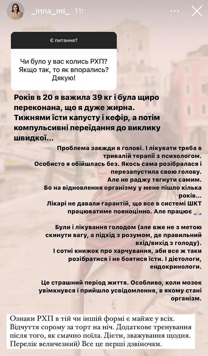 "Були і лікування голодом (але вже не з метою скинути вагу, а підхід з розумом, де правильний вхід/вихід з голоду. І сотні книжок про харчування, аби все ж таки розібратися і не боятися їсти. І дієтологи, едокринологи. Це страшний період життя. Особливо коли мозок увімкнувся і прийшло усвідомлення, в якому стані організм", - пригадала Інна.