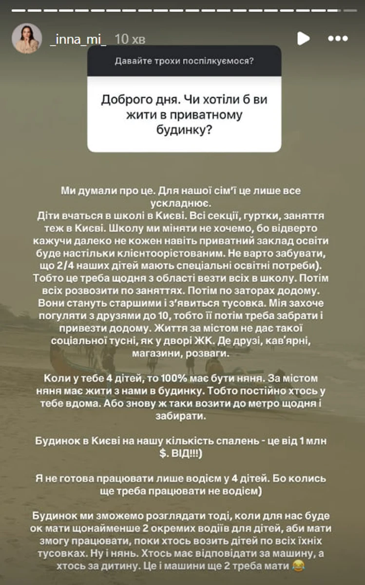 "Будинок у Києві на нашу кількість спалень - від 1 мільйона доларів! Від! Я не готова працювати лише водієм у чотирьох дітей. Бо колись ще треба працювати не водієм. Будинок ми зможемо розглядати тоді, коли для нас ок буде мати щонайменше двох окремих водіїв для дітей, аби мати змогу працювати, поки хтось возить дітей по всіх їхніх тусовках. Ну і нянь. Хтось має відповідати за машину, а хтось за дитину. Це і машини ще дві треба мати", - підсумувала Мірошниченко.