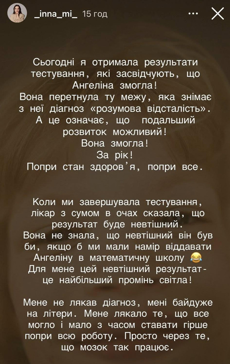 "Сьогодні я отримала результати тестування, які засвідчують, що Ангеліна змогла! Вона перетнула ту межу, яка знімає з неї діагноз "розумова відсталість". А це означає, що подальший розвиток можливий! Вона змогла! За рік! Попри стан здоров'я, попри все", - поділилася радістю багатодітна мама.
