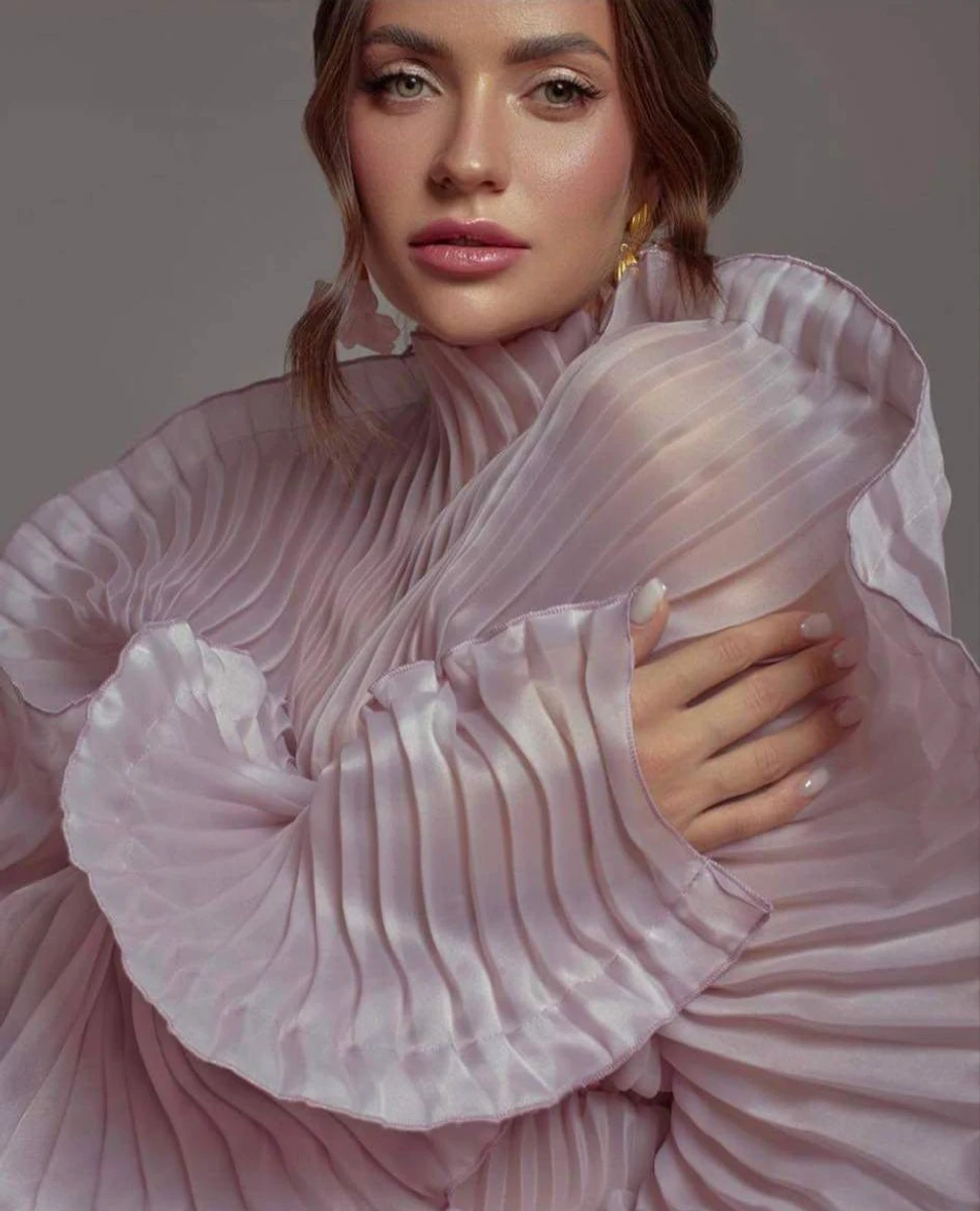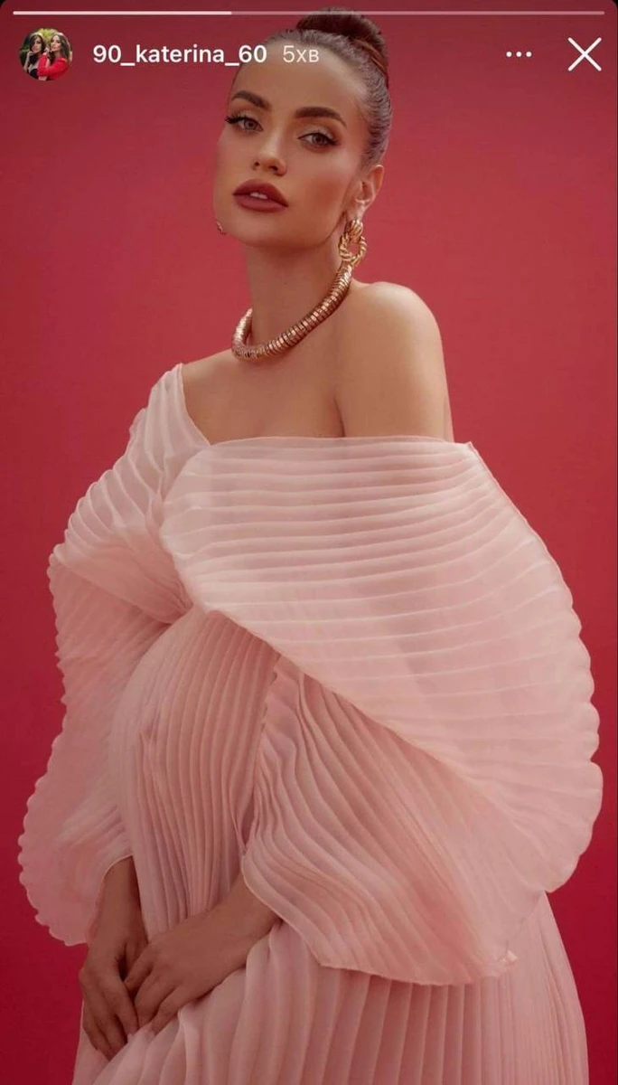 На знімку Катя позує у легкій ніжно-рожевій напівпрозорій сукні з драпуванням. Вбрання підкреслило вже чималий живіт невістки Марченко.