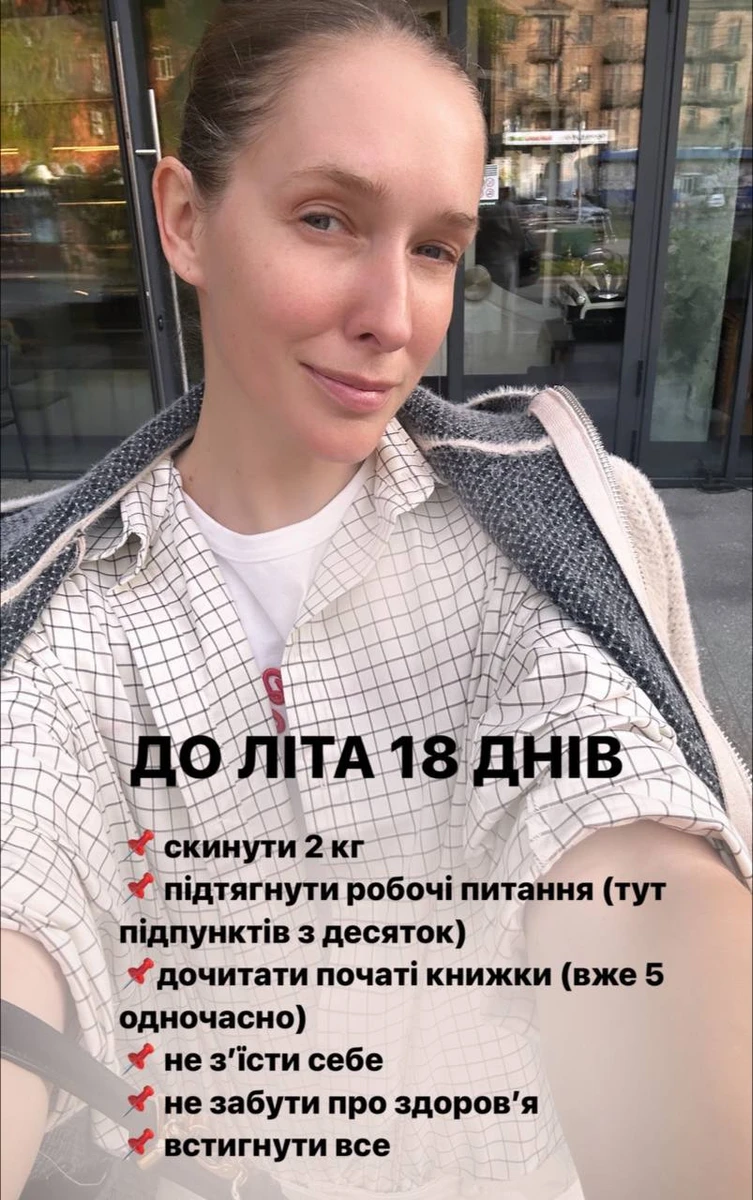 До літа Катерина також планує: скинути 2 кг, підтягнути робочі питання, дочитати початі книжки (до речі, нині Осадча читає 5 водночас), не зʼїсти себе, не забути про здоров'я і "встигнути все".