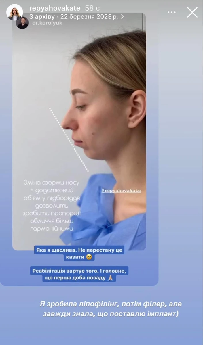 На запитання підписниці, чому вона просто не обрала корекцію філерами, Катерина зазначила, що філер треба колоти часто, а ментопластика раз і не все життя. Крім того, саме про цю операцію блогерка мріяла ще до ринопластики.