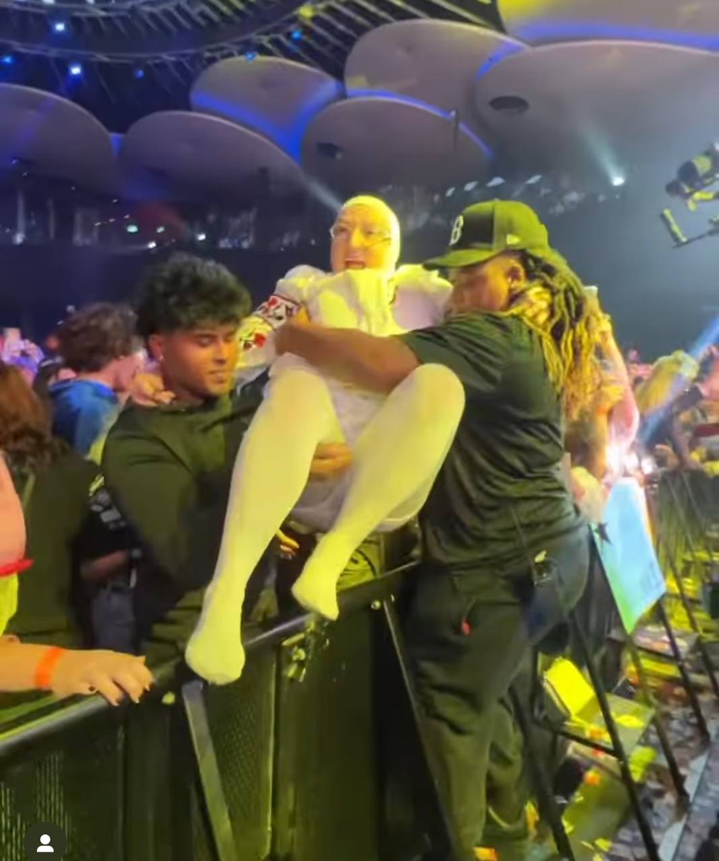 На відео, яке оприлюднили в Instagram видно, як Ірина спустилася зі сцени до глядачів і намагалася перелізти через огорожу.