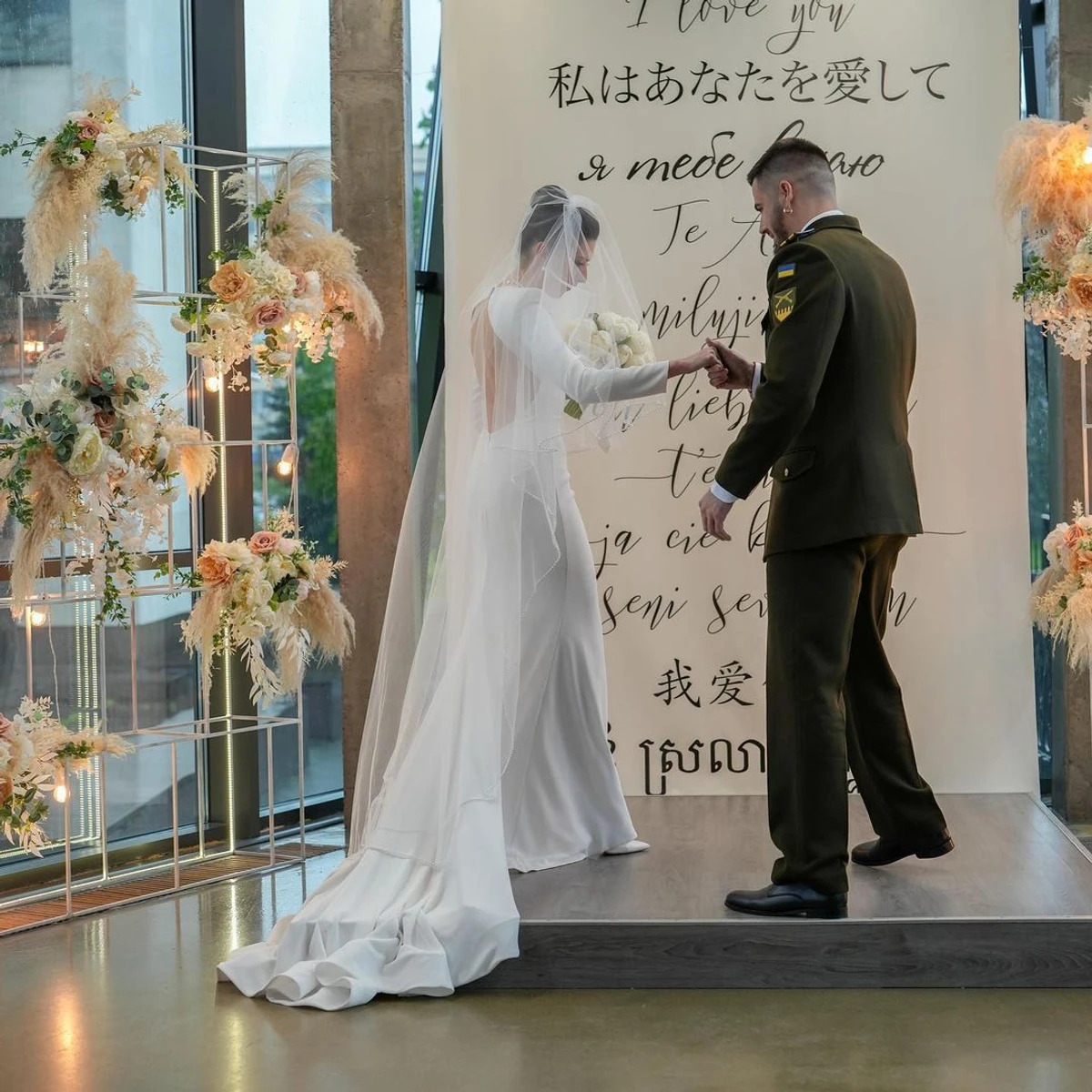 На світлинах 34-річна Марія позує у білому обтислому весільному платті, а її новоспечений чоловік у парадній формі з відзнаками.