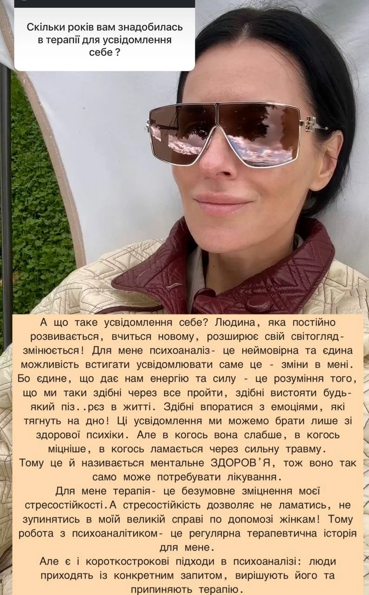 "Свого часу мені це розуміння дало одне просте питання до себе : "Маша, в тебе ж все добре: діти здорові, роботи купа, тебе кохає до нестями чоловік, ти подорожуєш та багато заробляєш. То чому твій світ пофарбувався в сірий колір? Чому все дратує? Чому нічого взагалі не хочеться?". І я звернулася до психоаналітика. Це було одне з найкращих рішень в моєму житті. В мирному житті, підкреслю", - пригадала Єфросиніна.
