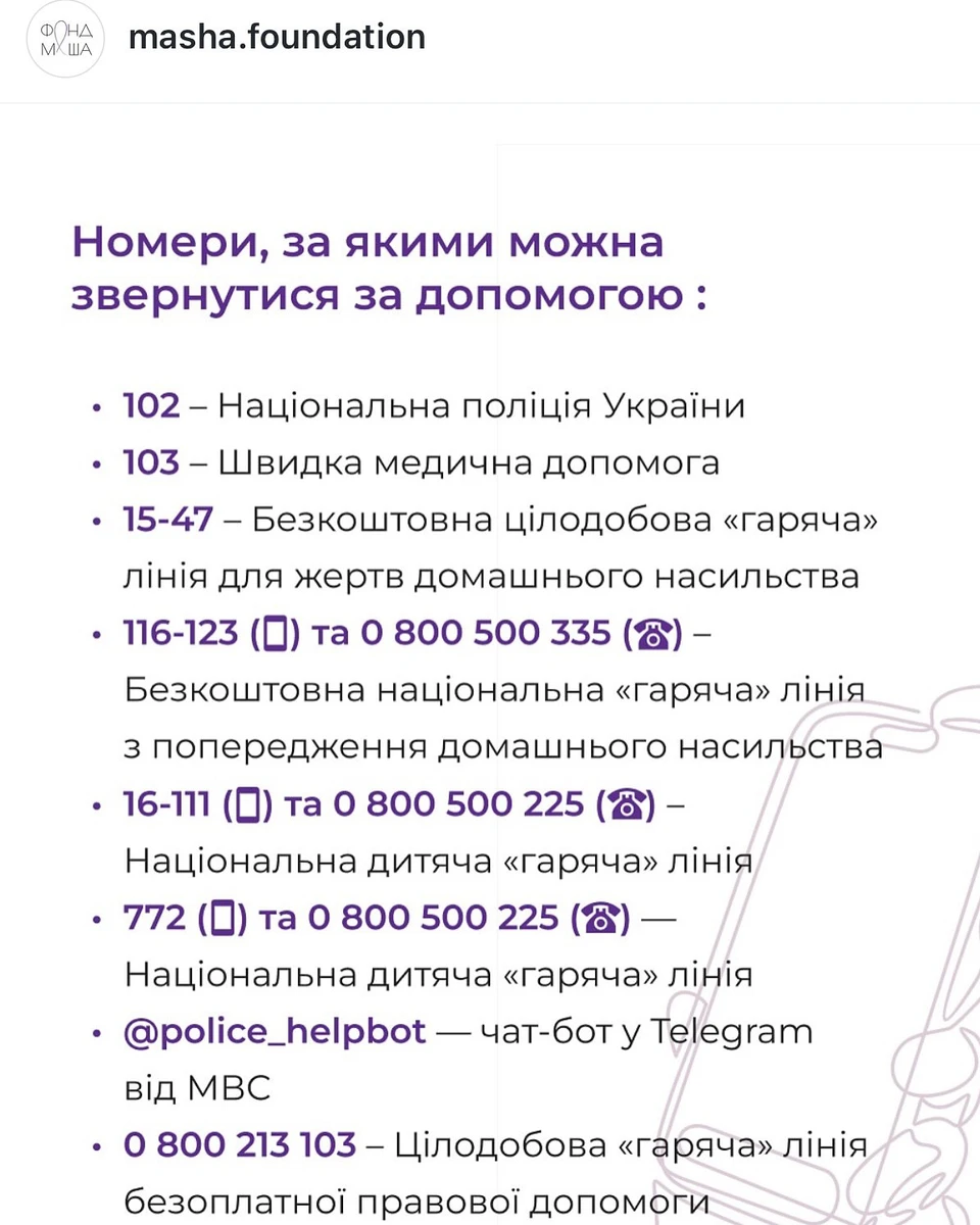 Єфросиніна також залишила номери, за якими можна звернутися за допомогою.