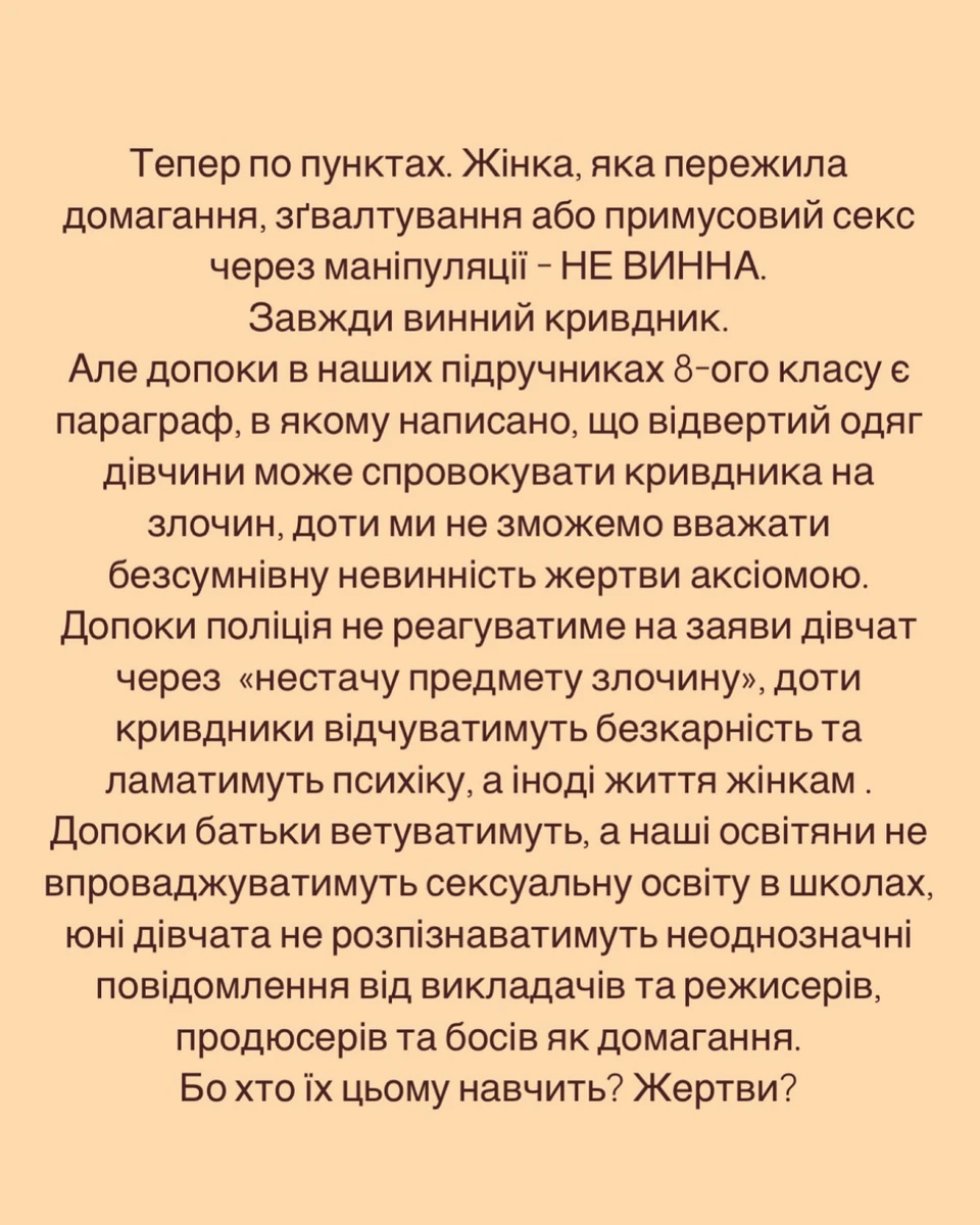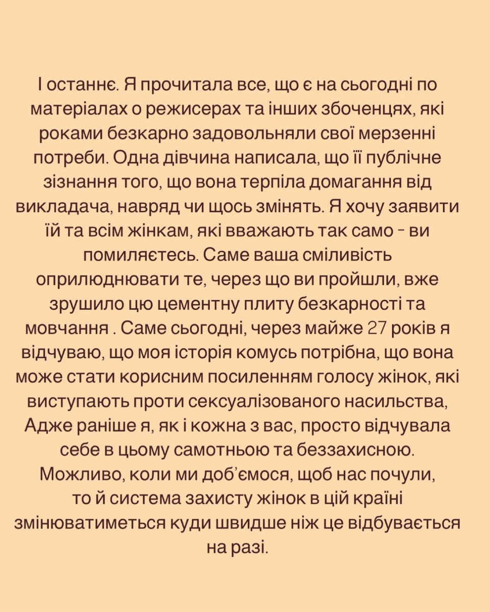 "Так він почав мене торкатися. І одного разу взяв за шию та впʼявся в мої губи своїм мерзенним смердючим від сигарет ротом, пробиваючи мої стиснуті зуби своїм довгим шорстким язиком. Паралельно намагаючись залізти мені під трусики своїми ссохлими пальцями. Хотілося блювати. Я втекла. Нікому нічого не сказала".