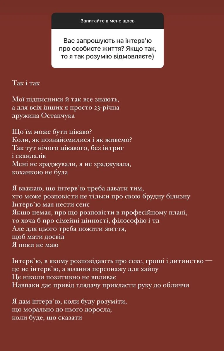 "Інтервʼю, в якому розповідають про секс, гроші і дитинство, це не інтервʼю, а юзання персонажу для хайпу. Це ніколи позитивно не впливає. Навпаки дає привід глядачу прикласти руку до обличчя. Я дам інтервʼю, коли буду розуміти, що морально до нього доросла; коли буде, що сказати", - додала Остапчук.