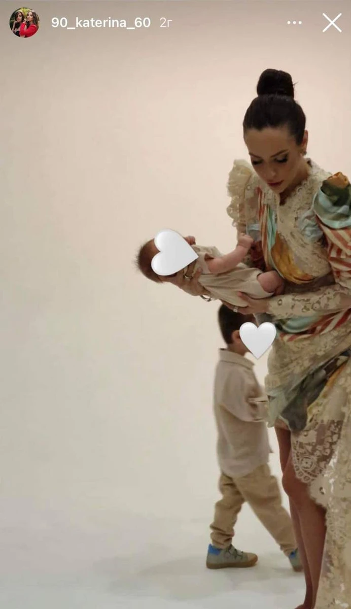 У своїх сторіс дівчина виклала кадр, ймовірно з бекстейджу сімейної фотосесії. На ньому вона у платті з незвичним принтом і мереживом тримає на руках немовля, яке одягнули у світлий комбінезон, а на тлі її старший син від Богдана Марченка.