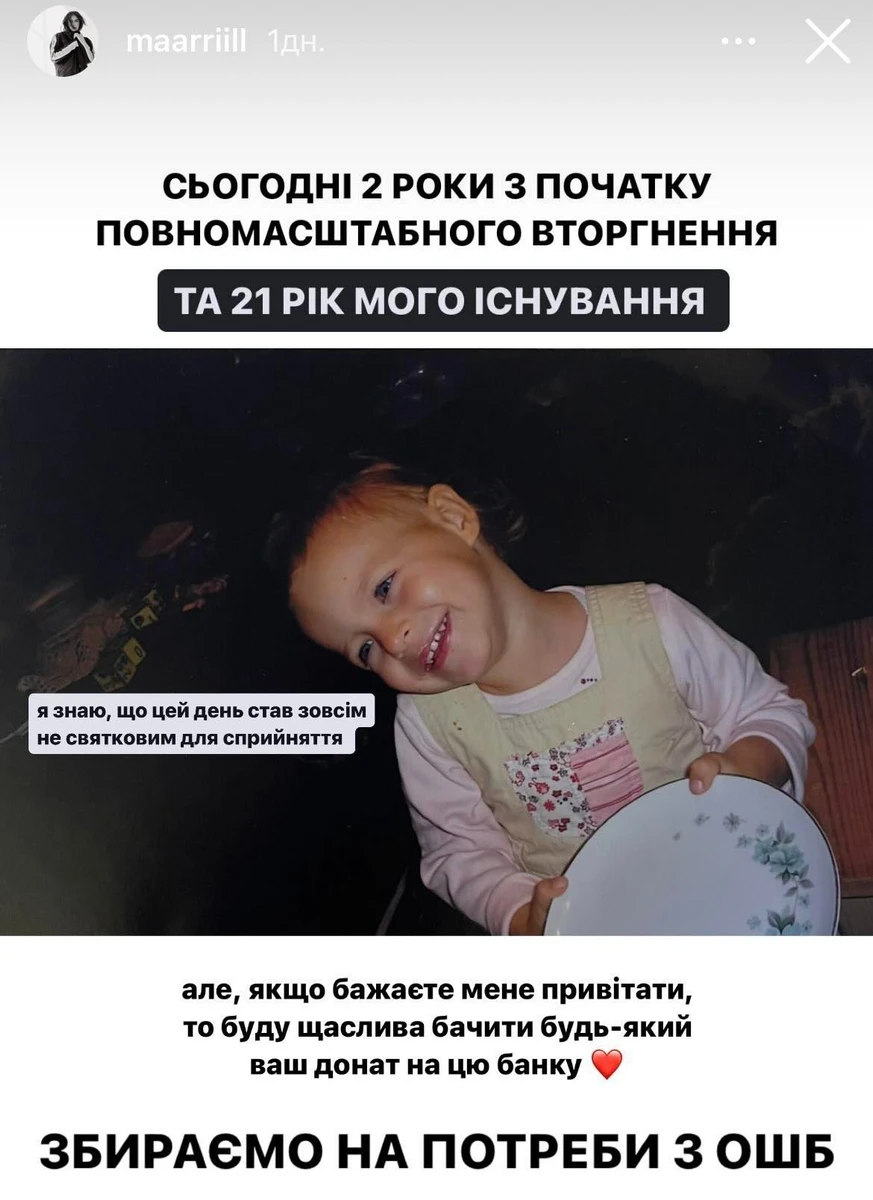"Сьогодні 2 роки з початку повномасштабного вторгнення та 21 рік мого існування. Я знаю, що цей день став зовсім не святковим для сприйняття", - написала дівчина.