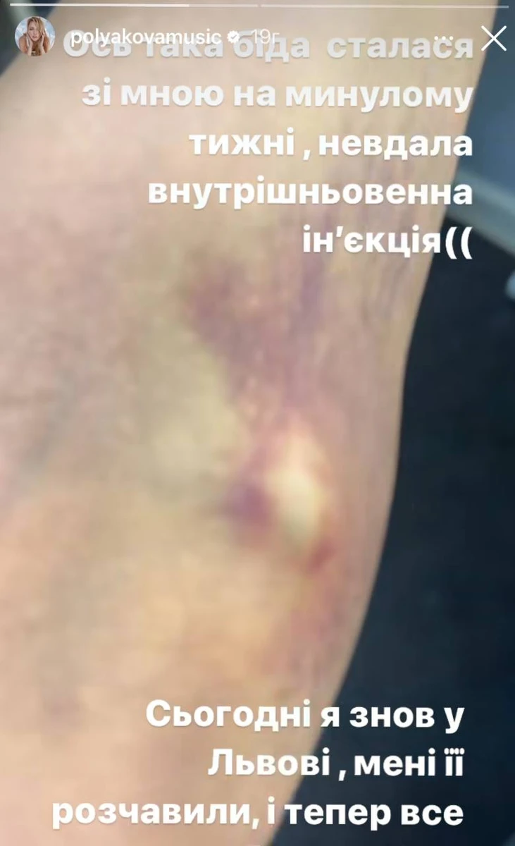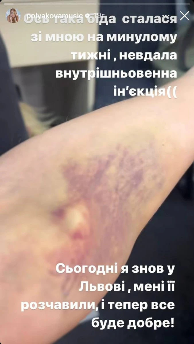 "Ось така біда сталася зі мною минулого тижня, невдала внутрішньовенна ін'єкція", - написала Полякова.