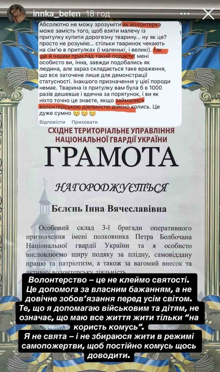 "Не треба нав'язувати іншим, що саме вони мають робити. Серйозно, у нас пів країни перетворилося на "радників по життю". А давайте тоді всім волонтерам скажемо: не народжуйте дітей, бо є діти в притулках. Не купуйте собак - є безпритульні. Не купуйте одяг - доношуйте старе, щоб не шкодити екології", - провела паралелі Інна, зауваживши, що подібне зазвичай пишуть ті, хто сам нічого не зробив.