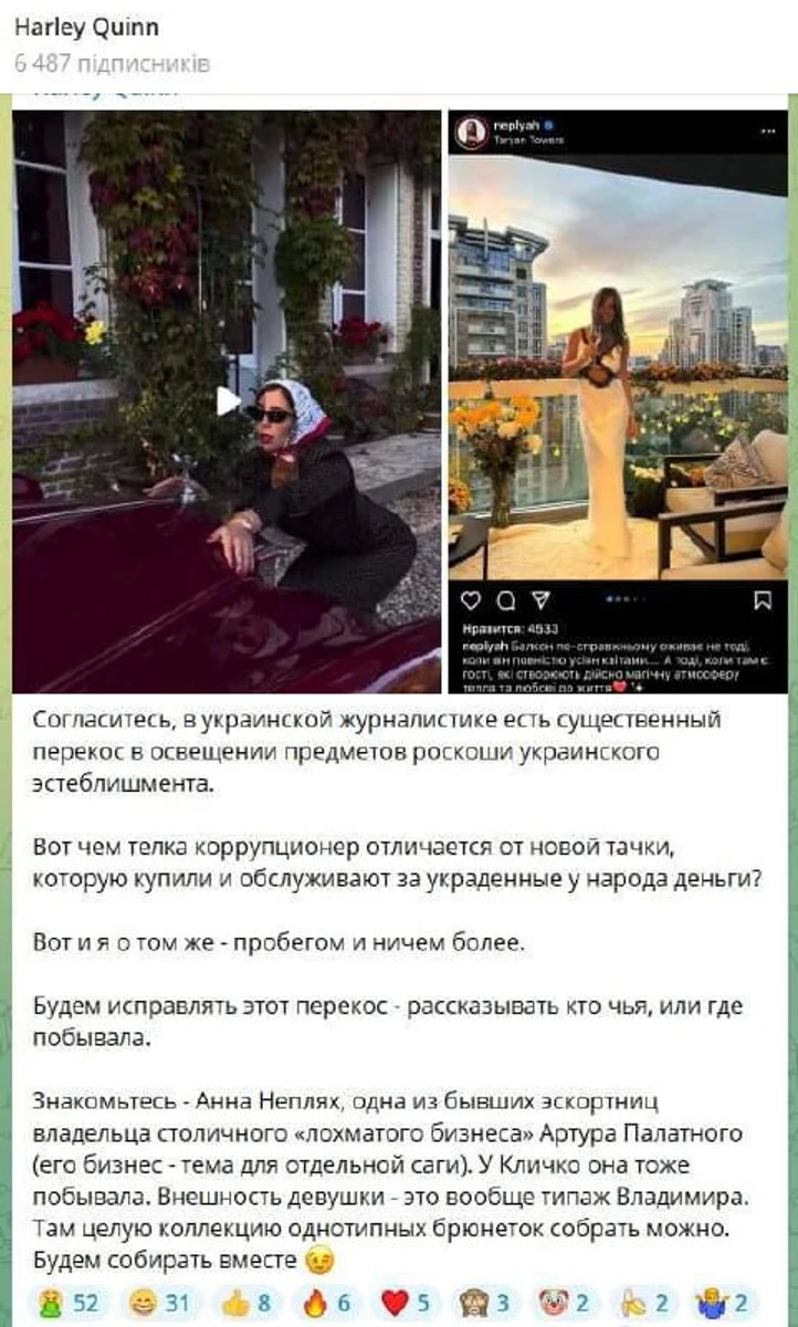 В Telegram-каналі Harley Quinn з'явилася інформація щодо надання 29-річною міс ескорт-послуг для народного депутата, керівника виконкому партії УДАР, 50-річного Артура Палатного.
