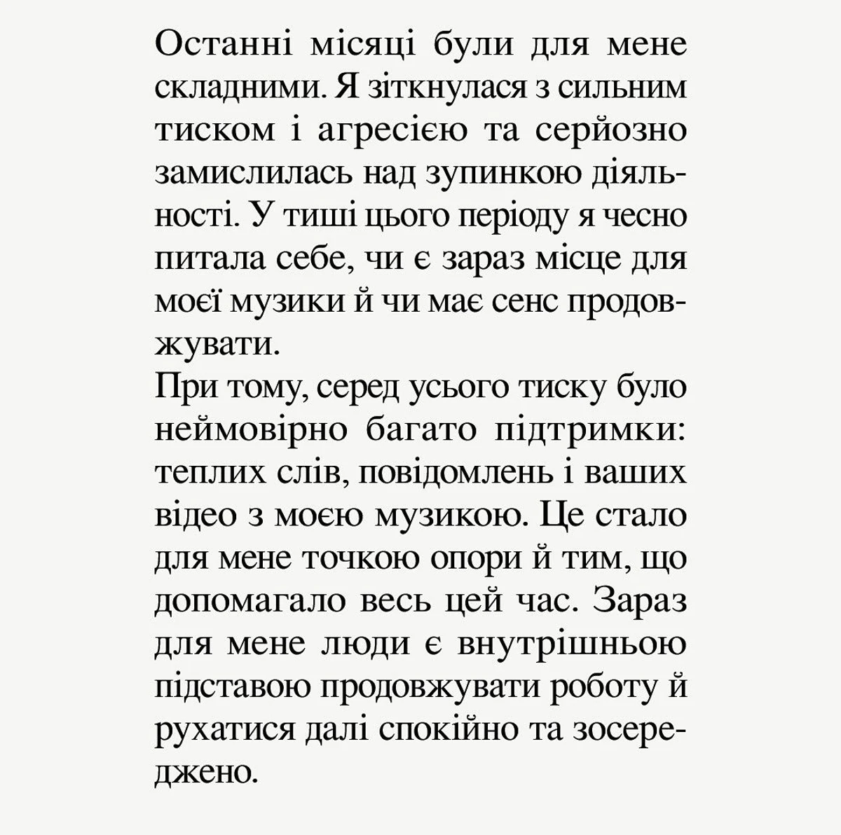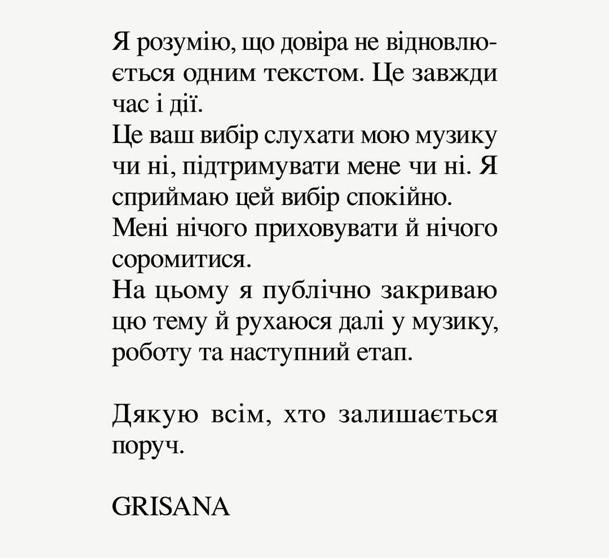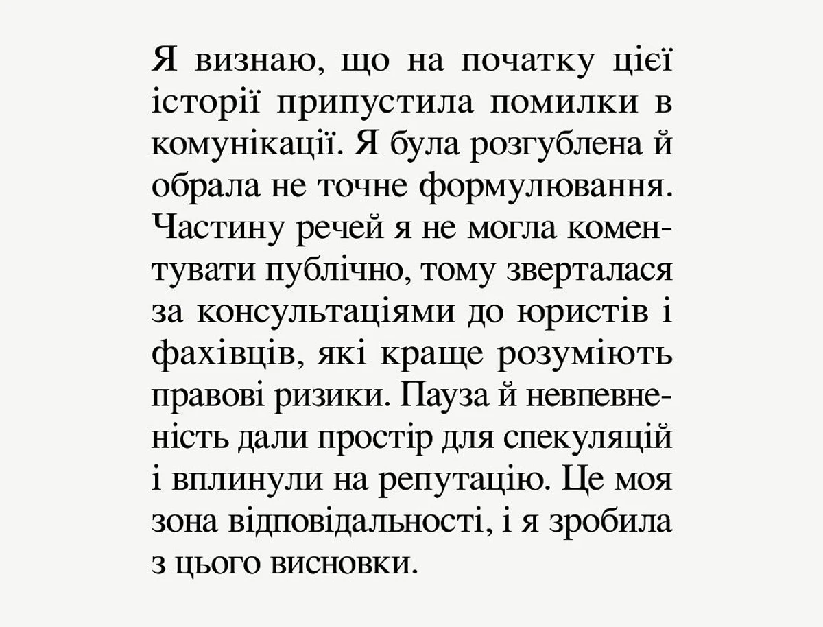 Дівчина витримала паузу і нарешті вийшла в мережу з заявою, в якій визнала, що припустилася помилик в комунікаціях і формулюваннях, але має намір залишатися в музиці.