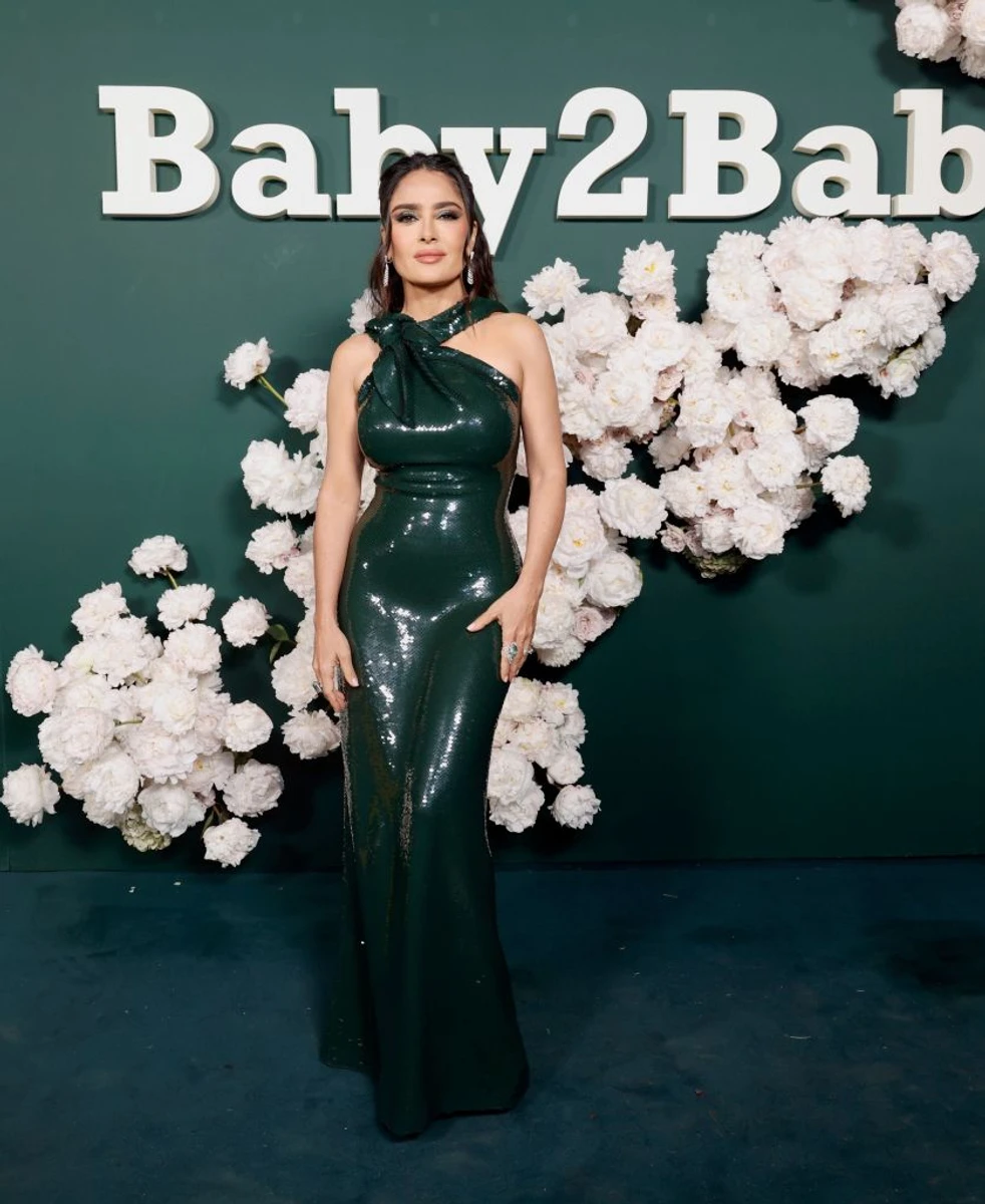 Наприклад, 57-річна акторка Сальма Хаєк одягнула обтислу максісукню темно-зеленого кольору. Вбрання, розшите паєтками, гарно підкреслило пишні форми зірки.