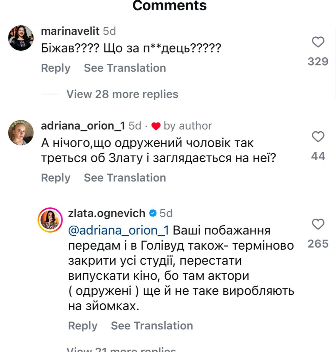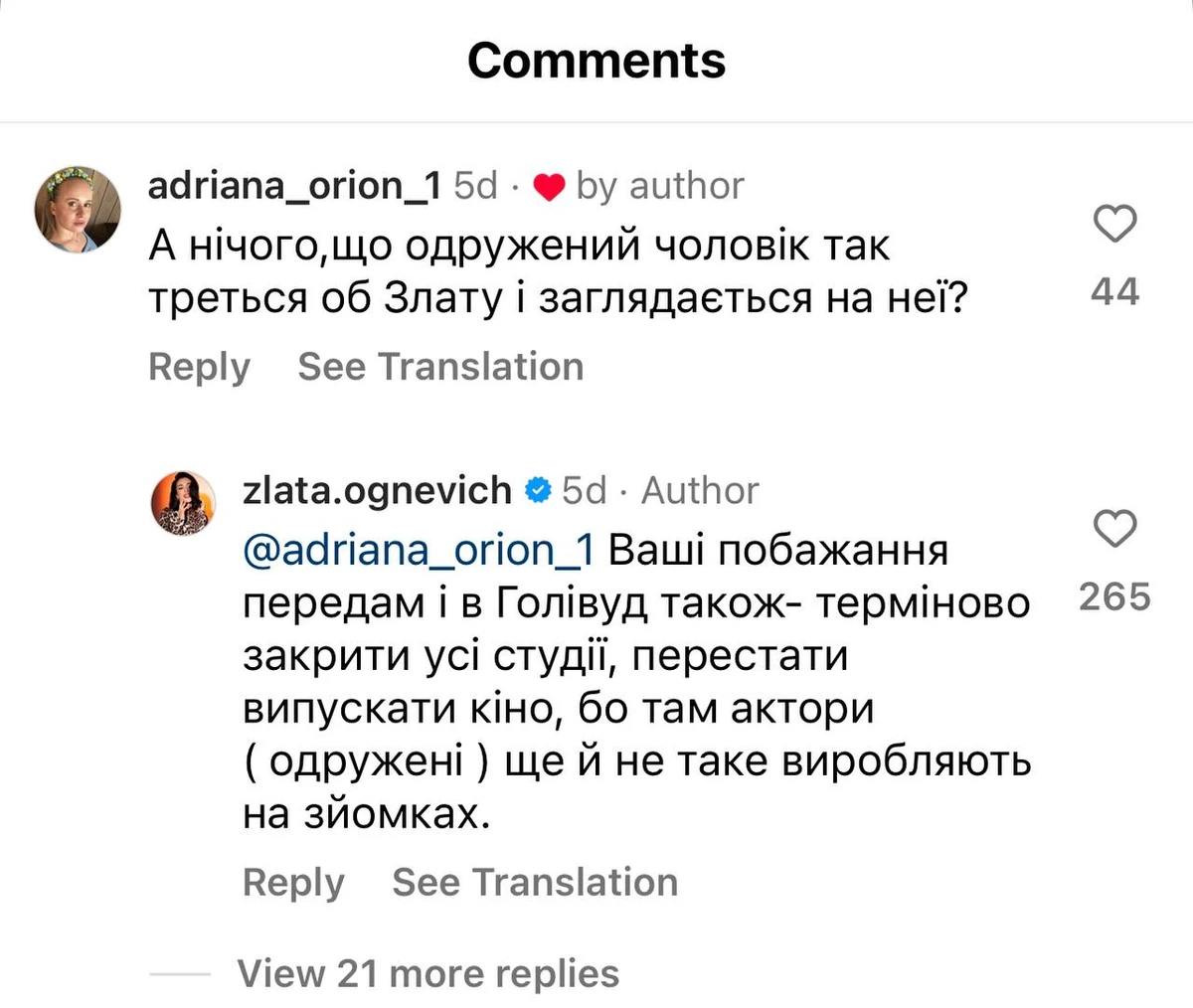 "Ваші побажання передам і в Голлівуд також: "Терміново закрити всі студії, припинити випускати кіно, бо там актори одружені ще й не таке виробляють на зніманнях", - відповіла Злата.