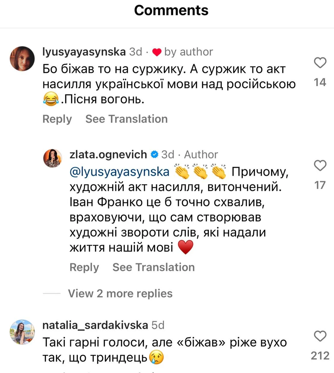 "Художній акт насилля, витончений. Іван Франко це б точно схвалив, враховуючи, що сам створював художні звороти слів, які надали життя нашій мові", - відповіла на зауваження Огнєвіч.
