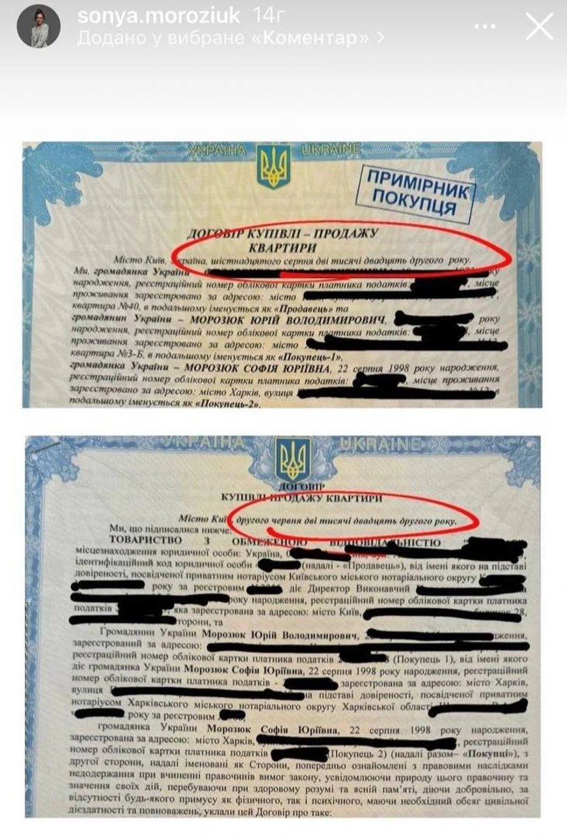 "У відповідь на звинувачення, що у "мене знайшли дві квартири". Квартири є. Але. Одну купив мій батько (продавши до цього нерухомість у Харкові), і оформив частку на мене. Він є платником. Це його гроші, не мої. Другу я купляла частковою допомогою батька, і він є співвласником", - написала Морозюк.