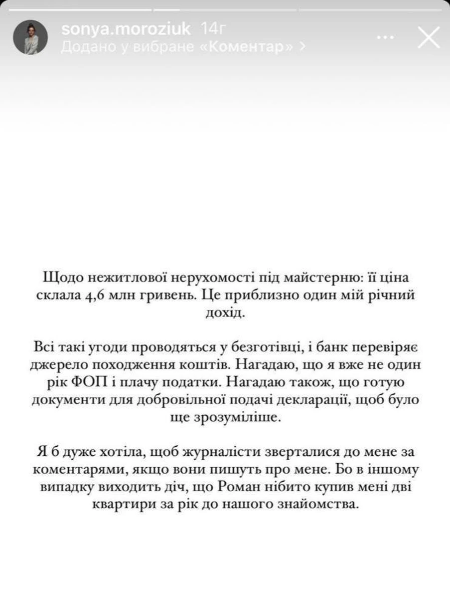 "Щодо нежитлової нерухомості під майстерню: її ціна склала 4,6 млн грн. Це приблизно один мій річний дохід. Всі такі угоди проводяться безготівкою, і банк перевіряє джерело надходження коштів. Нагадаю, що вже не один рік ФОП і плачу податки. Нагадаю також, що готую документи для добровільної подачі декларації, щоб було ще зрозуміліше" - зазначила Морозюк.