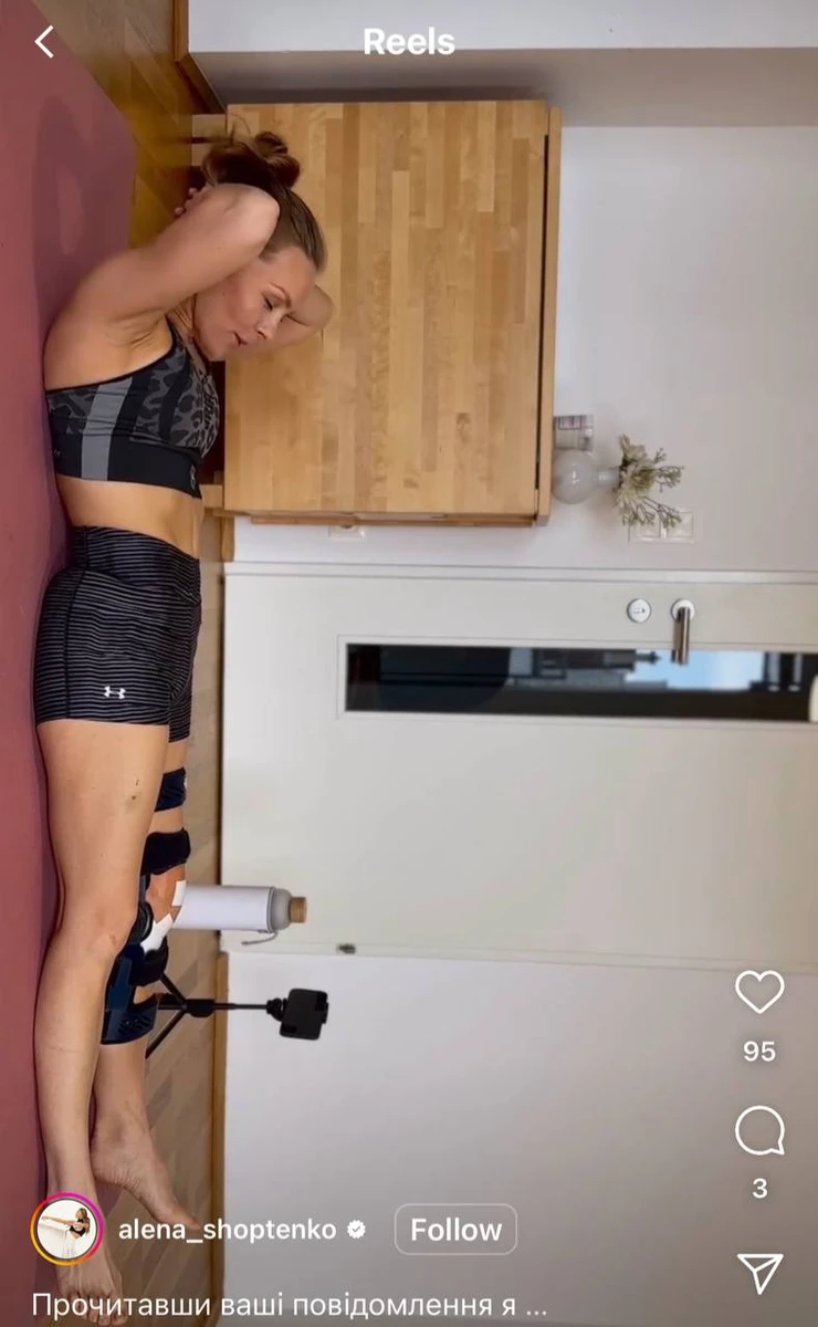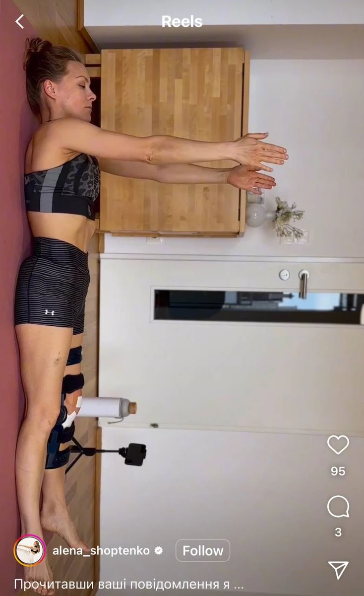 "Прочитавши ваші повідомлення, я побачила, що дехто з вас або отримав подібну травму і готується до операції, або також перебуває в процесі відновлення. Через неможливість повноцінно рухатися та компенсацію цього іншими частинами тіла страждає все тіло. Тож ділюся вправами, які тримають мене докупи в такий нелегкий фізично час", - написала танцівниця.