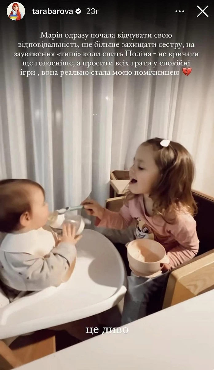 "Марія одразу почала відчувати свою відповідальність, ще більше захищати сестру, на зауваження "тиші", коли спить Поліна - не кричати ще голосніше, а просити всіх грати у спокійні ігри, вона реально стала моєю помічницею", - похвалилася Тарабарова.