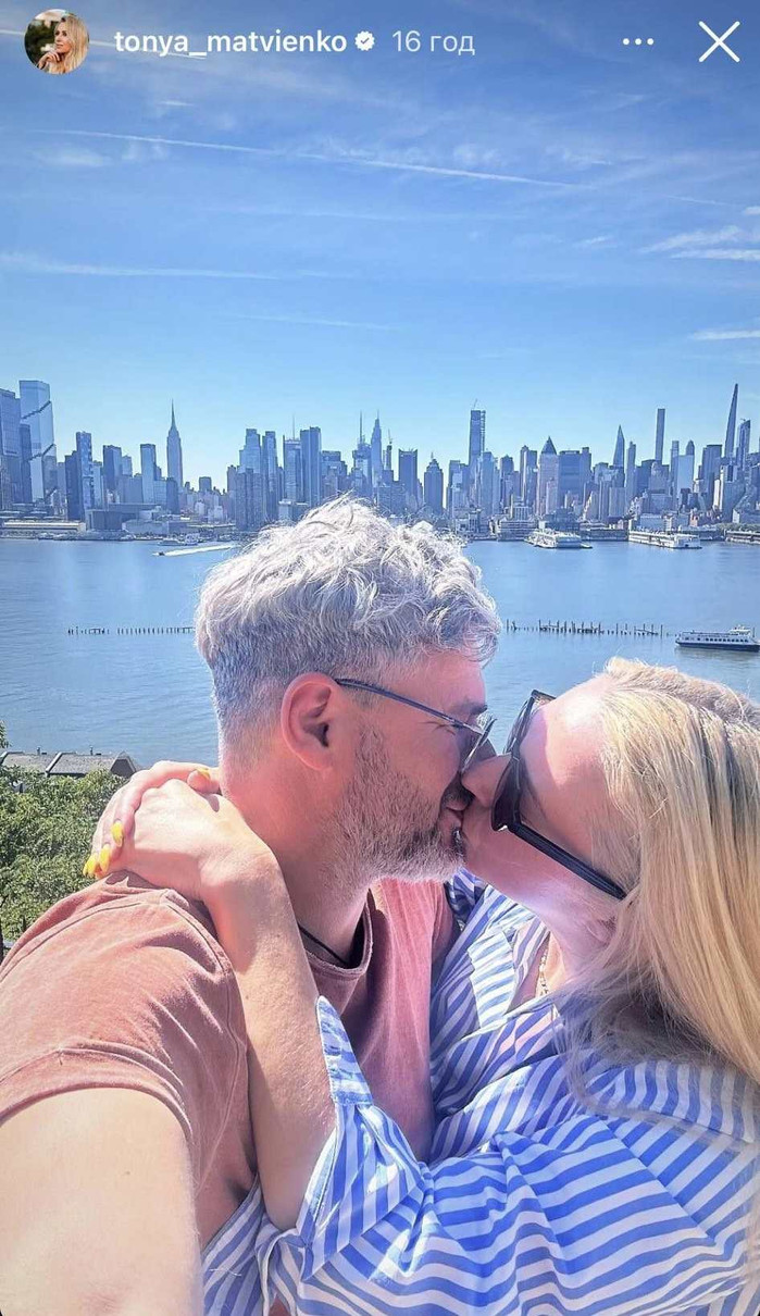 На одній зі світлин, якими поділилася 43-річна Тоня у сторіс, вони з чоловіком цілуються на тлі Нью-Йорка.