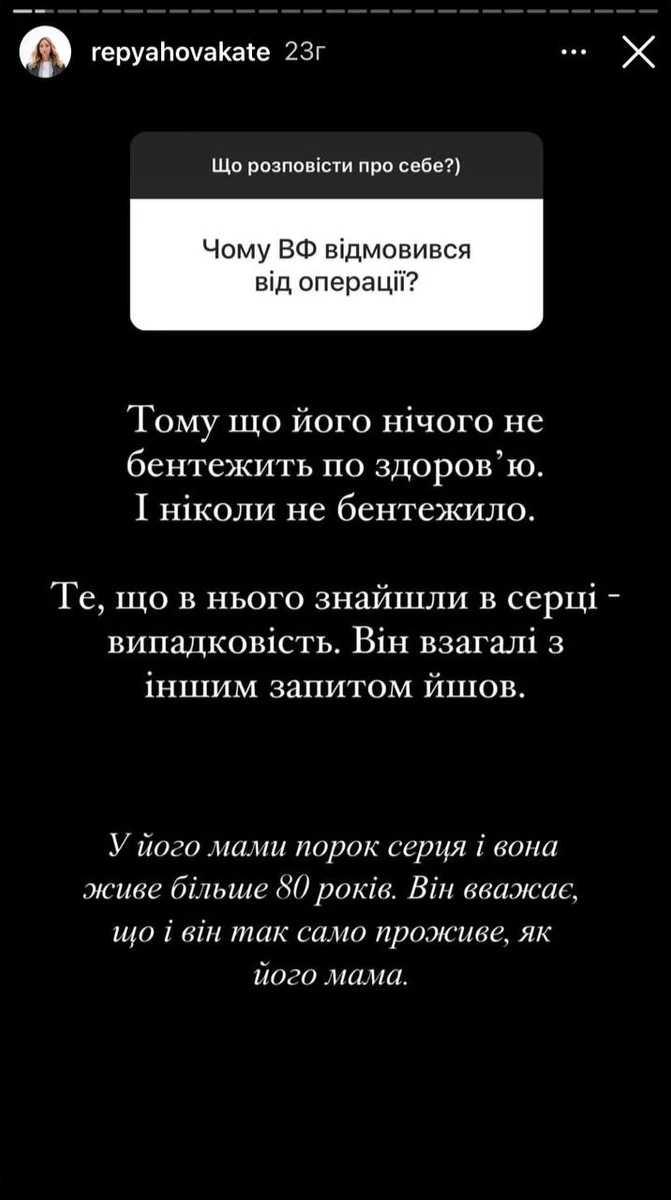 Репяхова відповідала на запитання підписників і її запитали, чому Віктор відмовився від хірургічного втручання.