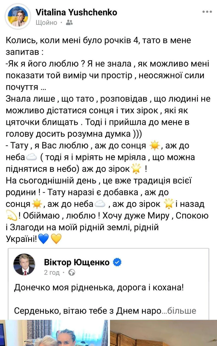 Теплі слова на адресу іменинниці та фотодобірку, де є архівний кадр, на якому Віктор Андрійович та маленька Віталіна зазнімковані коло школи 1-го вересня, політик опублікував у Facebook.