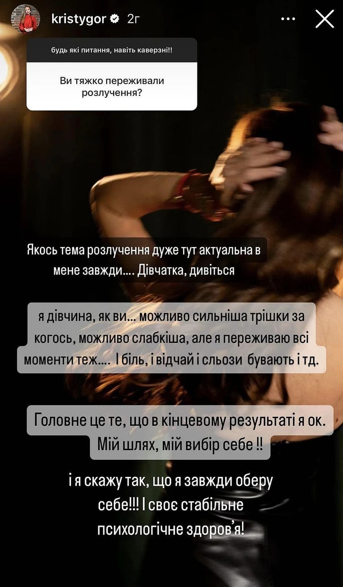 Також Христя відповіла, чи тяжко переживала розлучення. Нотаріуска запевнила, що як і у всіх, у неї бувають біль, відчай та сльози, але зрештою вона завжди обирає себе та своє стабільше психологічне здоров'я.