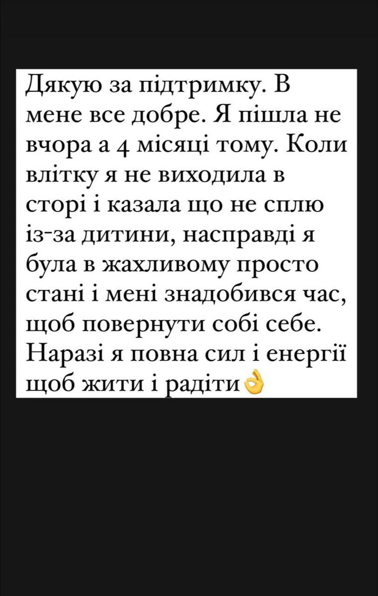 "Дякую за підтримку. В мене все добре. Я пішла не вчора, а 4 місяці тому. Коли влітку я не виходила в сторі і казала, що не сплю через дитину, насправді я була в жахливому просто стані, і мені знадобився час, щоб повернути собі себе. Наразі я повна
