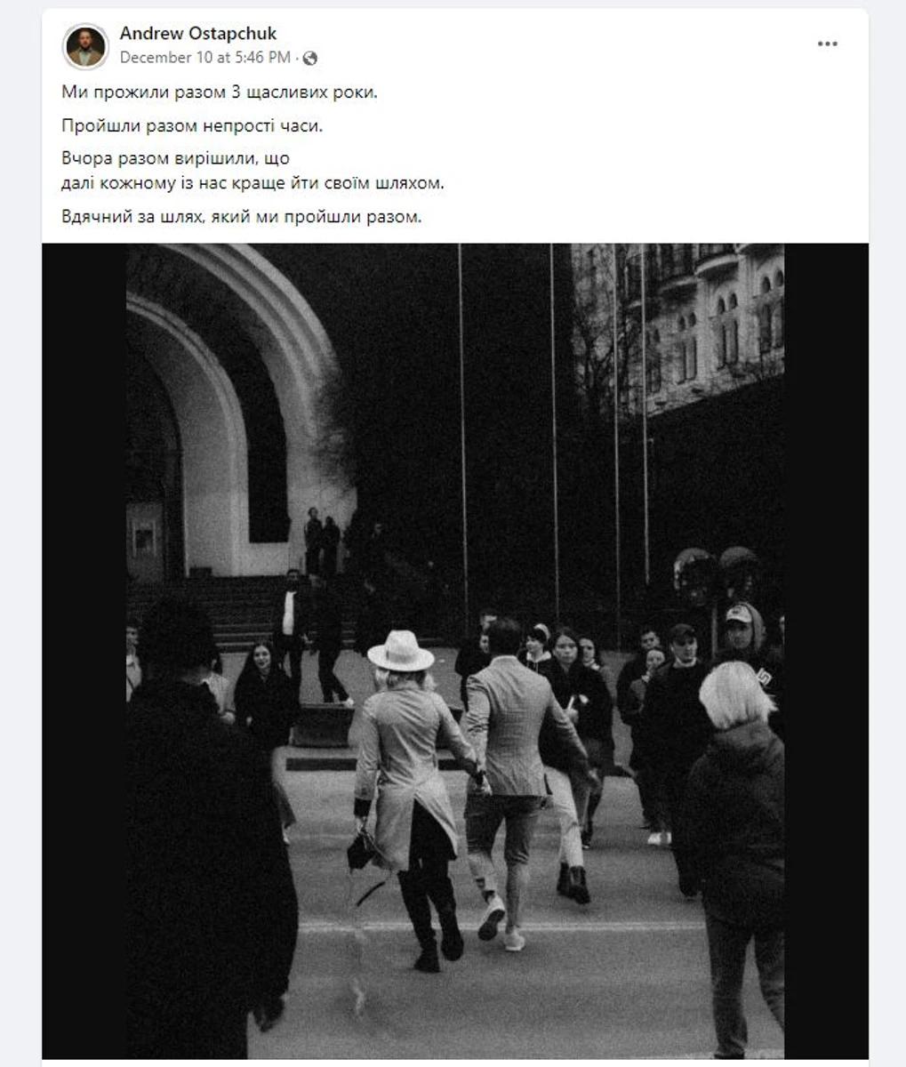 "Ми прожили разом 3 щасливих роки. Пройшли разом непрості часи. Вчора разом вирішили, що далі кожному із нас краще йти своїм шляхом. Вдячний за шлях, який ми пройшли разом", - зазначив Остапчук.